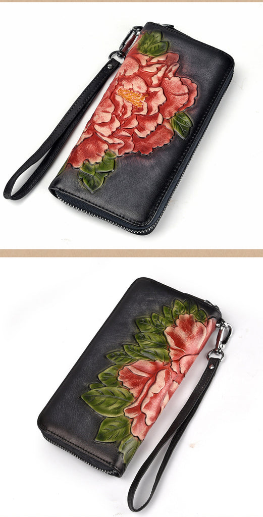 Design: Womens Peony Flower Leather Wristlet Wallet Zip Around Wallets Floral Ladies Zipper Clutch Wallet for Women