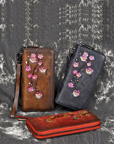 Design: Womens Plum Blossom Flower Leather Zip Around Wallet Wristlet Wallet Flower Ladies Zipper Clutch Wallet for Women