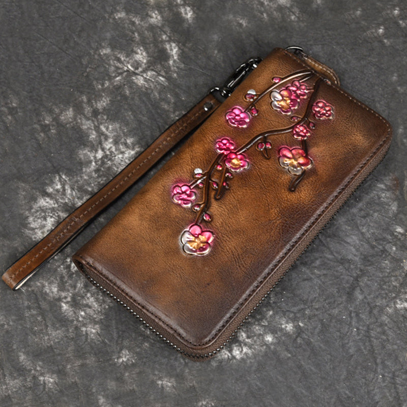 Style: Womens Plum Blossom Flower Leather Zip Around Wallet Wristlet Wallet Flower Ladies Zipper Clutch Wallet for Women