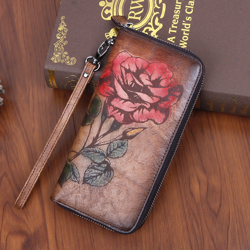 Womens Rose Flower Brown Leather Wristlet Wallets Zip Around Wallet Flower Ladies Zipper Clutch Wallet for Women