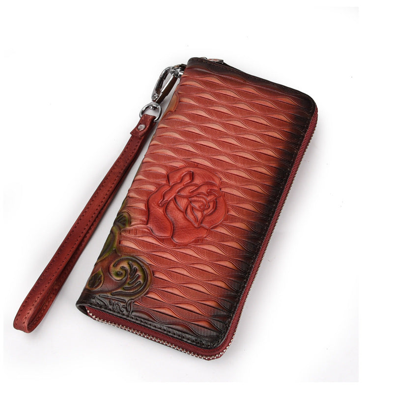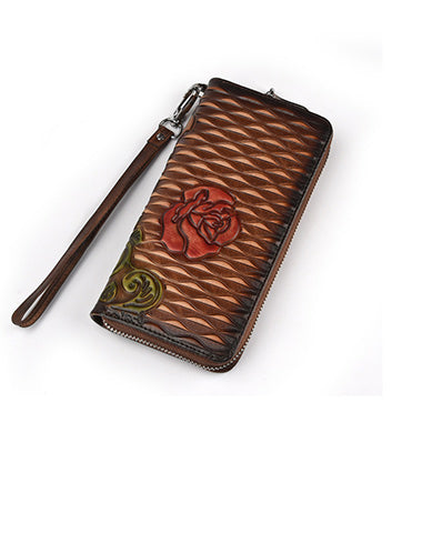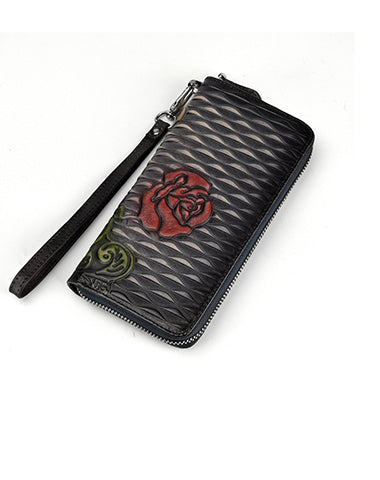 Design: Womens Rose Flower Red Leather Zip Around Wallet Wristlet Wallet Flower Ladies Zipper Clutch Wallet for Women