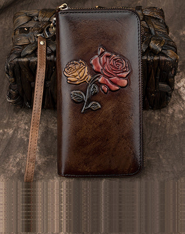 Womens Rose Flowers Leather Wristlet Wallets Zip Around Wallet Flowers Ladies Zipper Clutch Wallet for Women