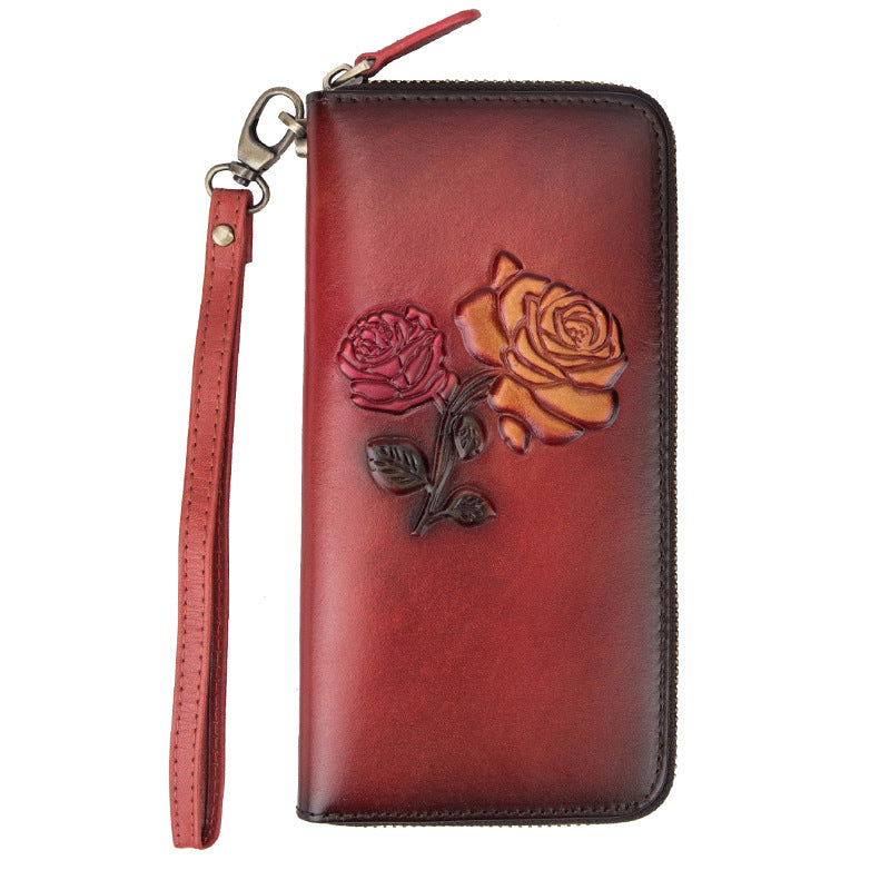 Womens Rose Flowers Red Leather Wristlet Wallets Zip Around Wallet Flowers Ladies Zipper Clutch Wallet for Women