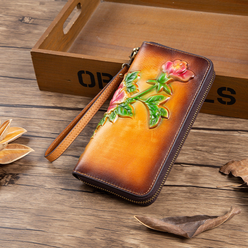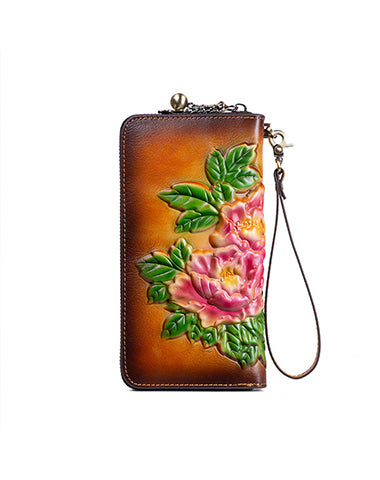 Womens Tan Leather Zip Around Wallets Peony Flower Wristlet Wallets Floral Ladies Zipper Clutch Wallet for Women