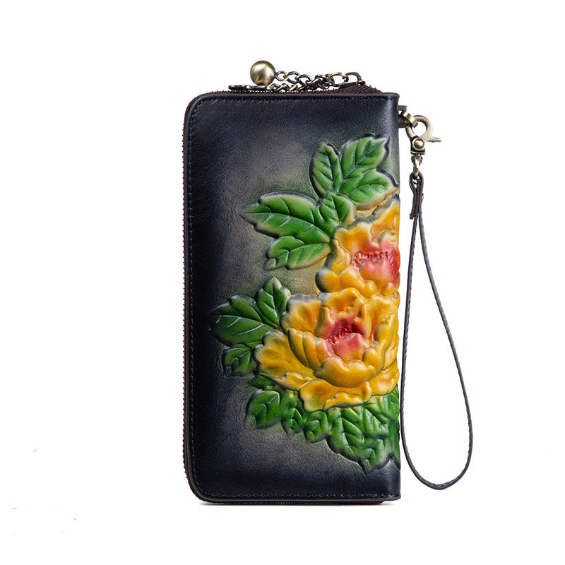Design: Womens Leather Zip Around Wallet Peony Flower Wristlet Wallet Floral Ladies Zipper Clutch Wallet for Women