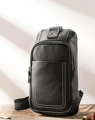 Style: Black Casual Leather Mens 8inches Large Messenger Bag Chest Bag Black One Shoulder Backpack for Men