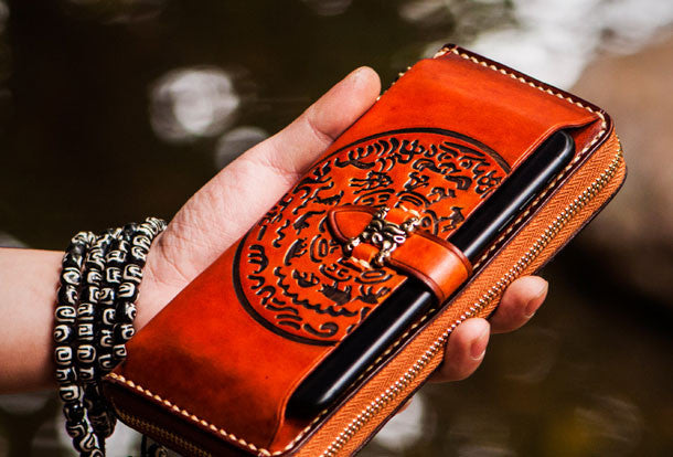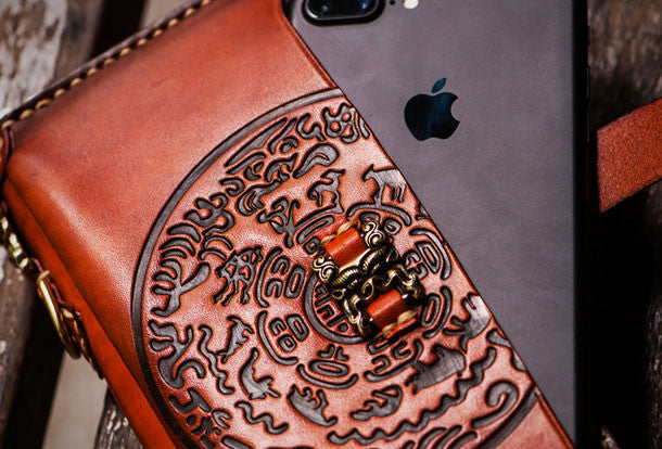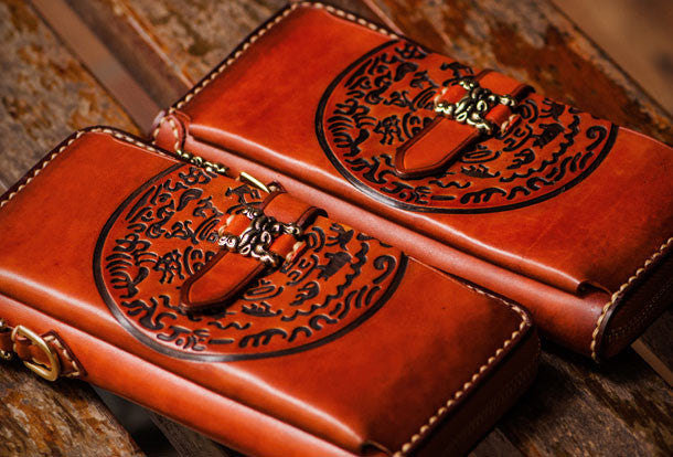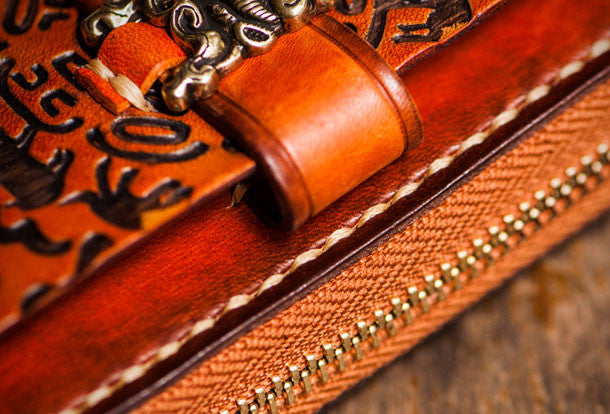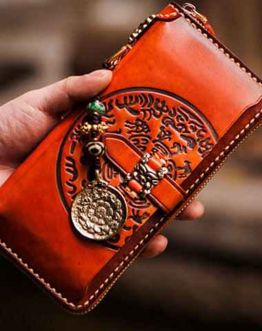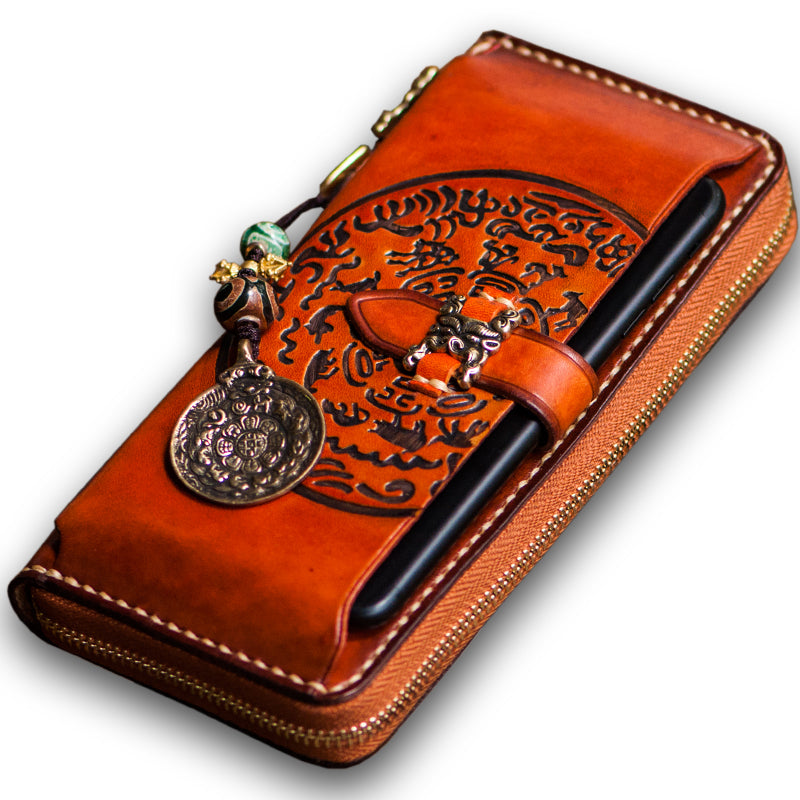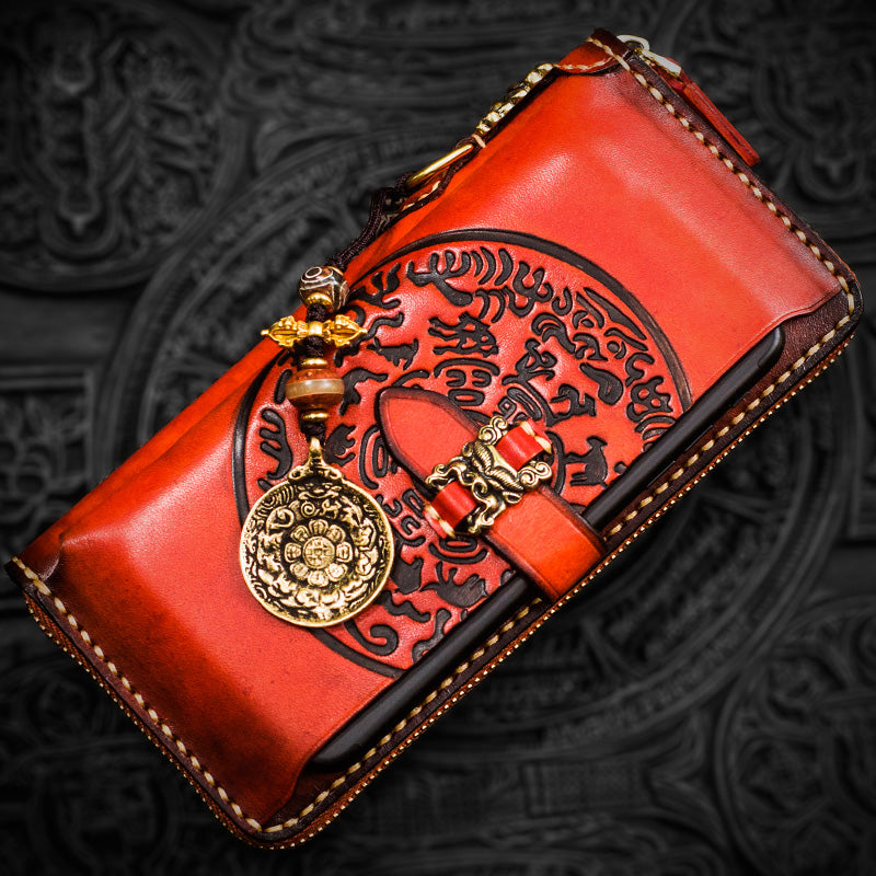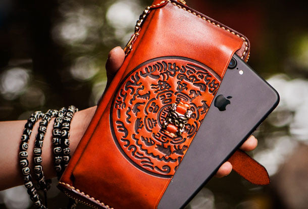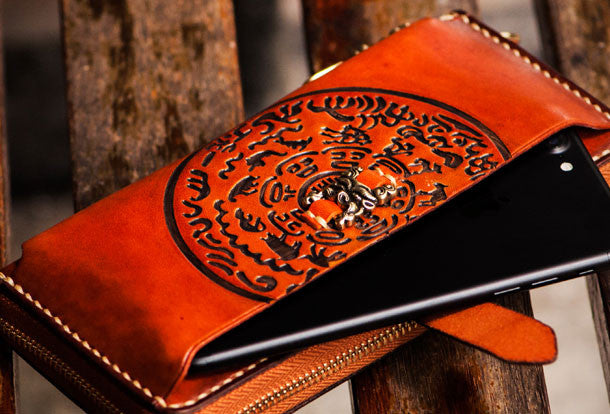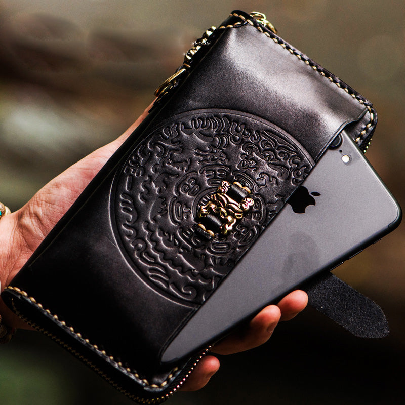 Design: Black Carved Tooled Tibet biker Clutch zip Leather Wallet