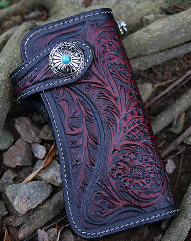 Design: Handmade Tooled Leather Mens Biker Chain Wallet Long Biker Wallet with Chain for Men