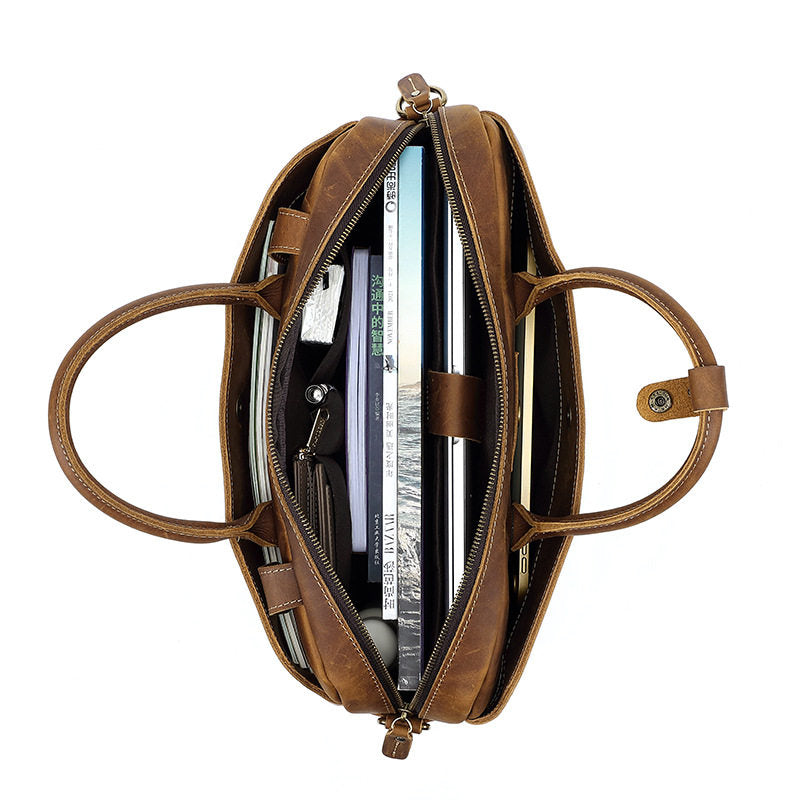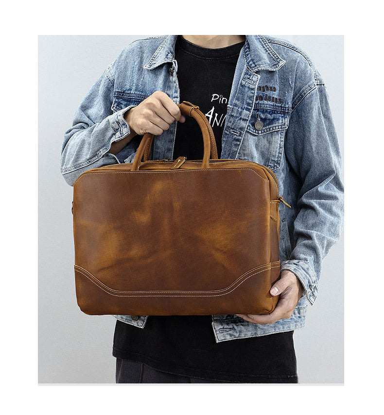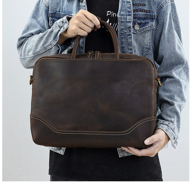 Introducing the 15 Inch Leather Laptop Bag, a timeless and functional companion designed for the modern professional. Expertly crafted from rugged full-grain crazy horse leather, this spacious and stylish 15 inch Laptop Shoulder Bag measures 38cm x 30cm x 8cm, offering ample storage without compromising on sleek design. Weighing just 1.5kg, it balances durability with everyday comfort, making it the ideal computer bag for 15 inch laptop users who value both aesthetics and organization.