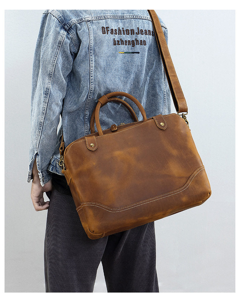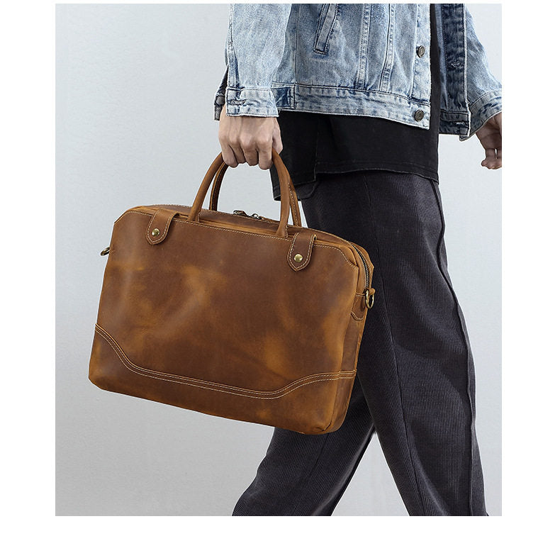 Introducing the 15 Inch Leather Laptop Bag, a timeless and functional companion designed for the modern professional. Expertly crafted from rugged full-grain crazy horse leather, this spacious and stylish 15 inch Laptop Shoulder Bag measures 38cm x 30cm x 8cm, offering ample storage without compromising on sleek design. Weighing just 1.5kg, it balances durability with everyday comfort, making it the ideal computer bag for 15 inch laptop users who value both aesthetics and organization.