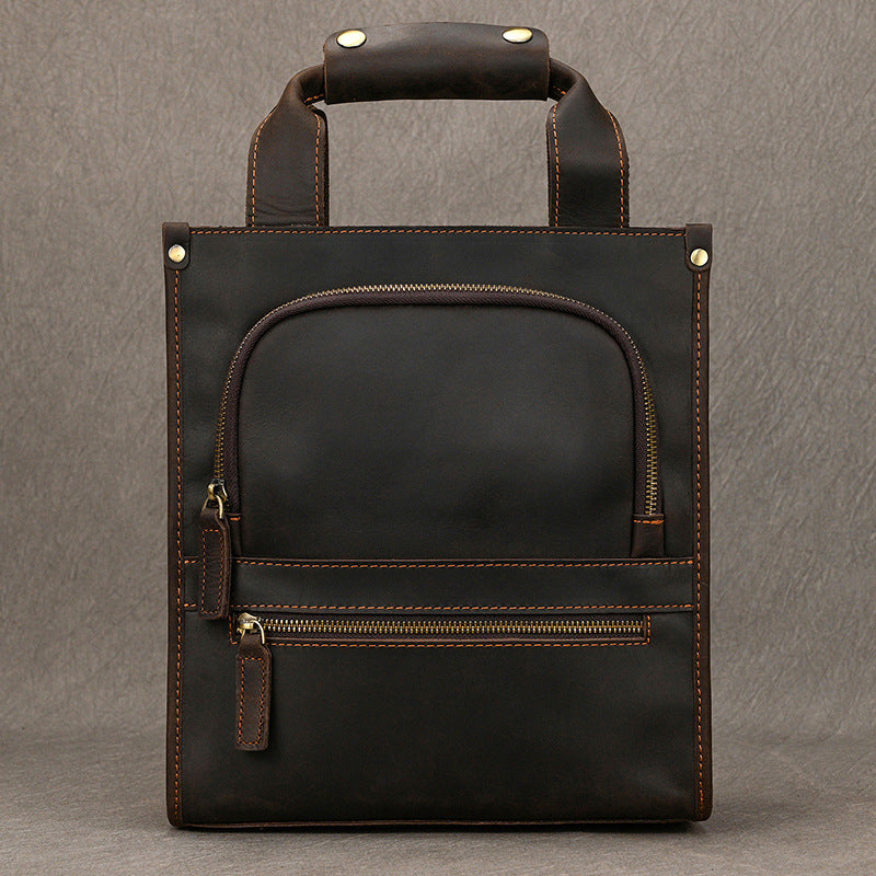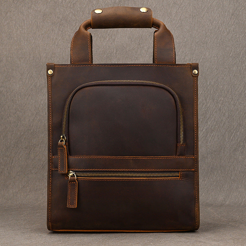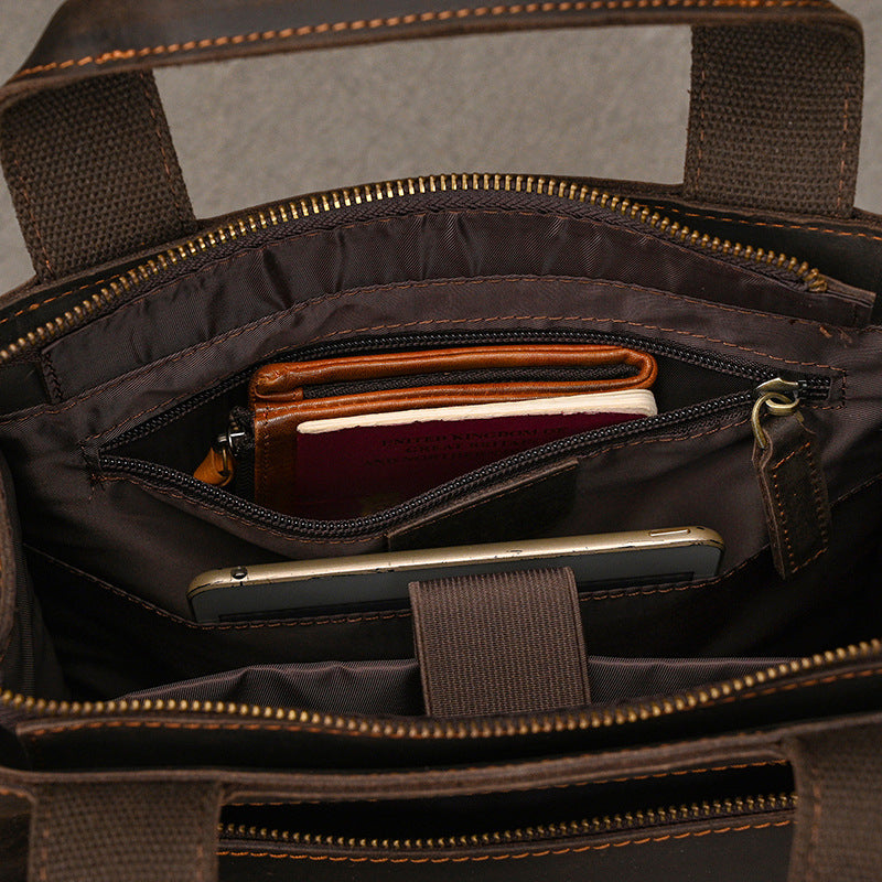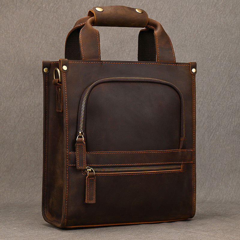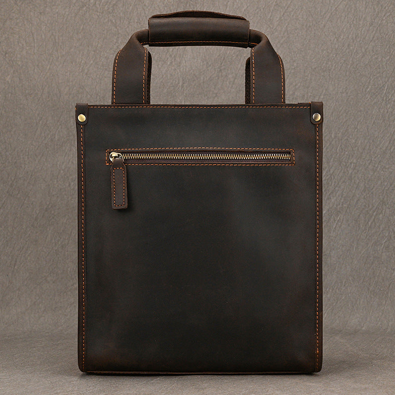 Discover the perfect fusion of professional elegance and practical organization with our sophisticated Vertical Briefcase, expertly crafted for the modern businessman who values both style and functionality. This medium-sized Business Handbag for Men measures 31cm x 26.5cm x 11cm, featuring a sleek vertical design that maintains a professional silhouette while offering impressive storage capacity. Meticulously constructed from full-grain crazy horse leather in rich brown and dark brown options, this versatile Office Handbag for Men is the ideal companion for your daily commute, meetings, and professional engagements.