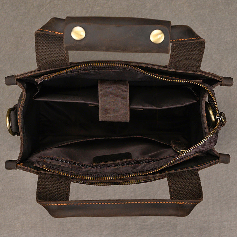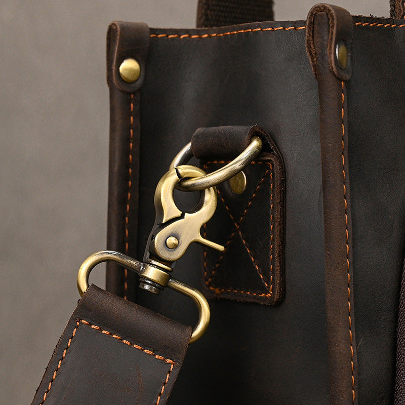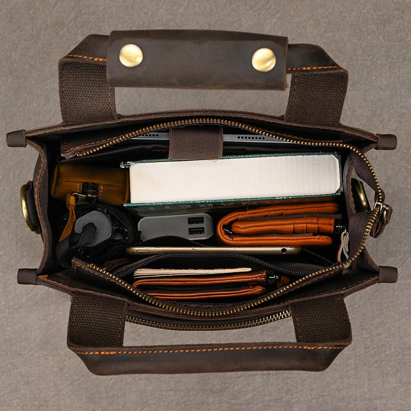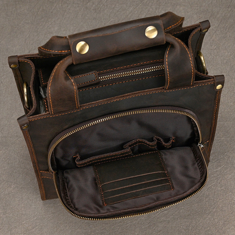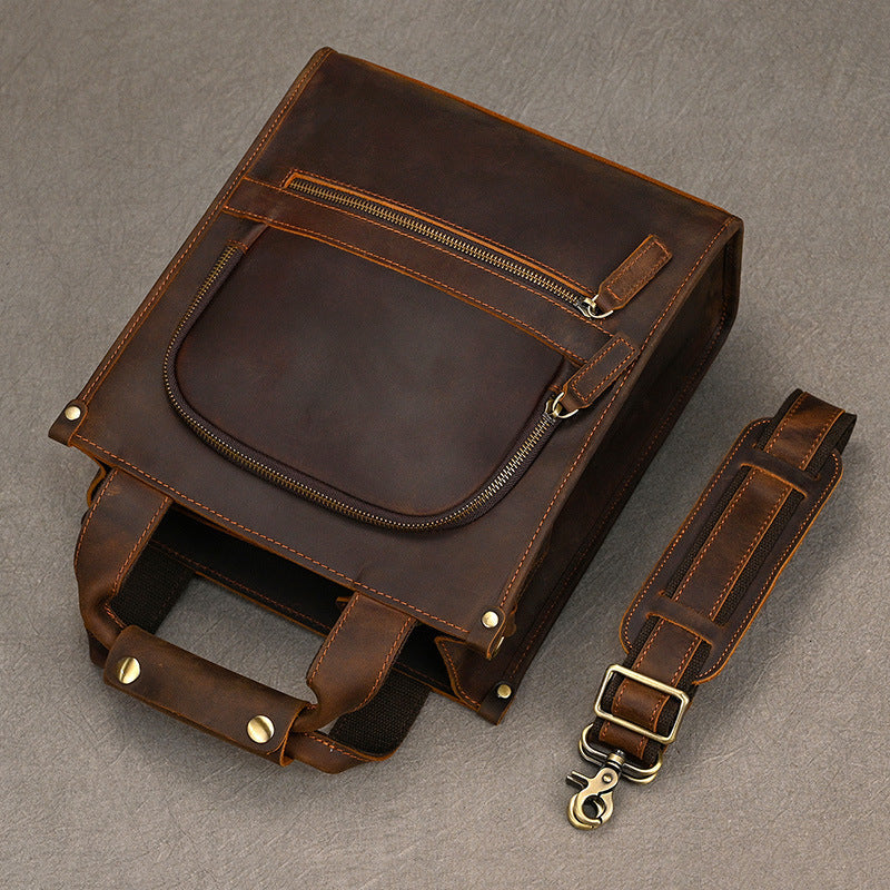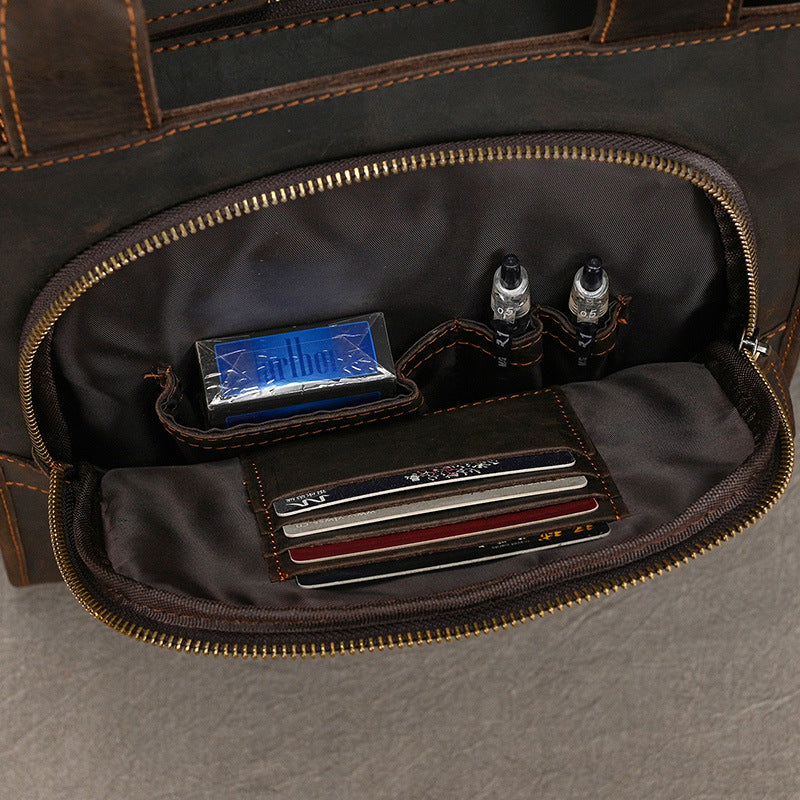 Discover the perfect fusion of professional elegance and practical organization with our sophisticated Vertical Briefcase, expertly crafted for the modern businessman who values both style and functionality. This medium-sized Business Handbag for Men measures 31cm x 26.5cm x 11cm, featuring a sleek vertical design that maintains a professional silhouette while offering impressive storage capacity. Meticulously constructed from full-grain crazy horse leather in rich brown and dark brown options, this versatile Office Handbag for Men is the ideal companion for your daily commute, meetings, and professional engagements.