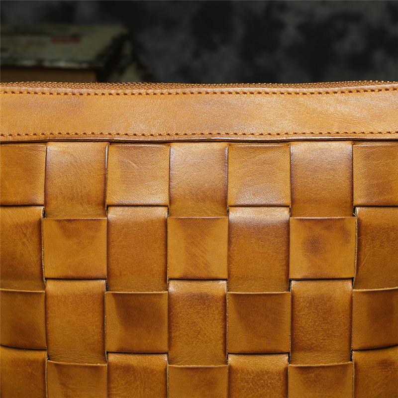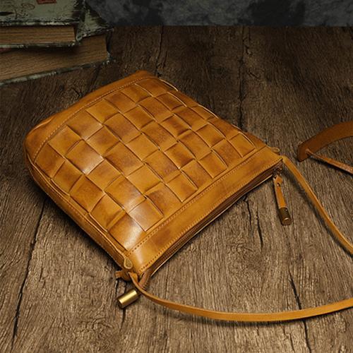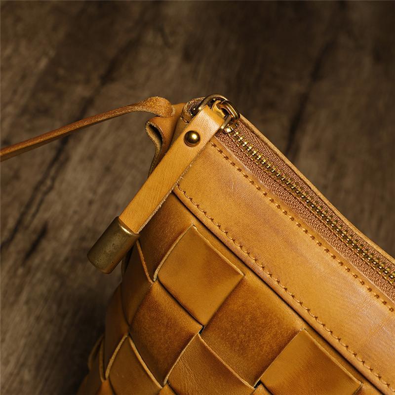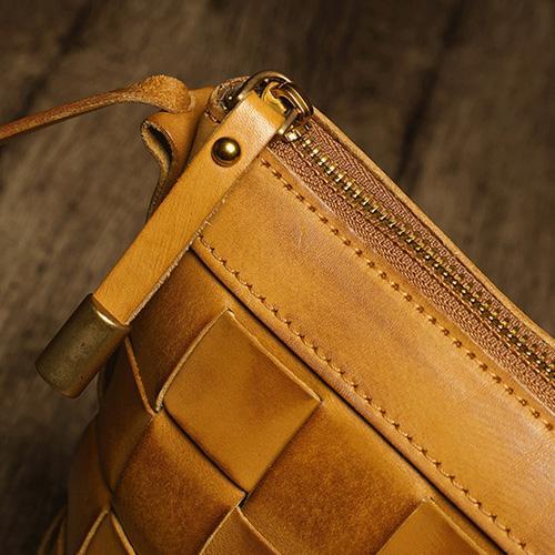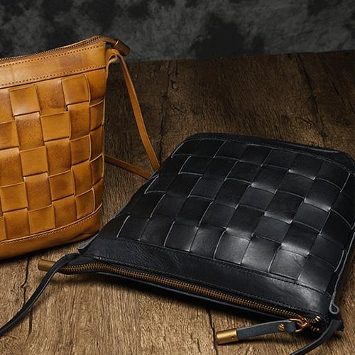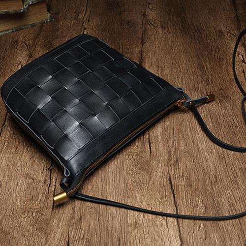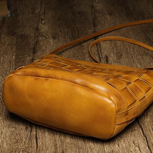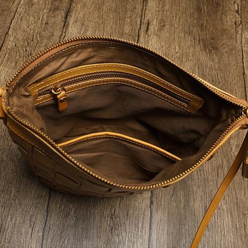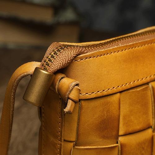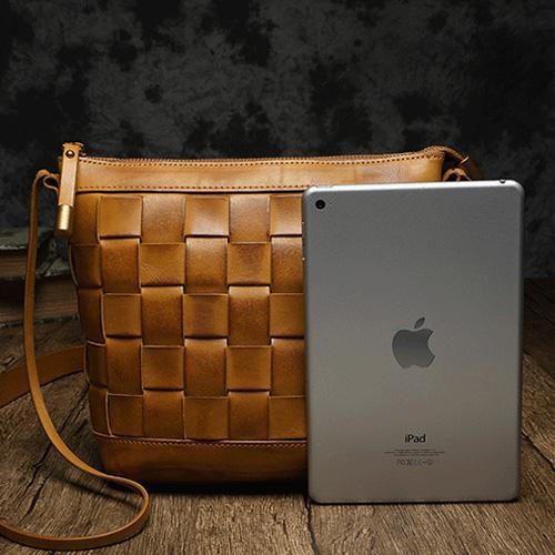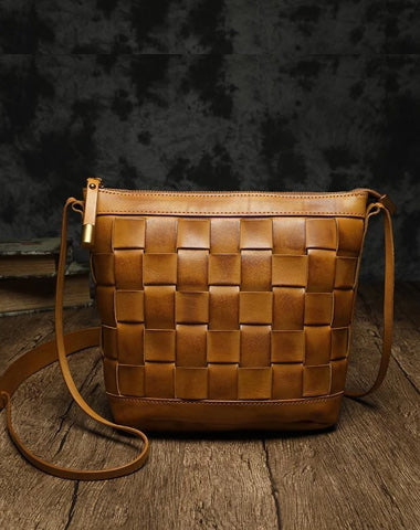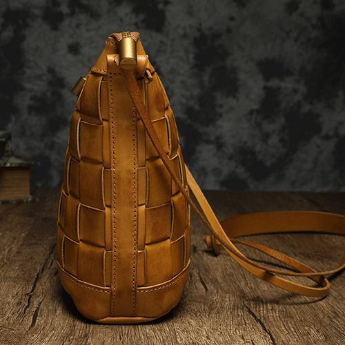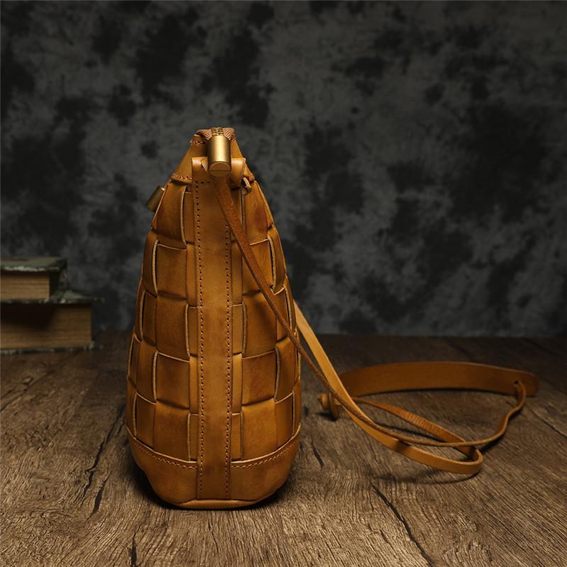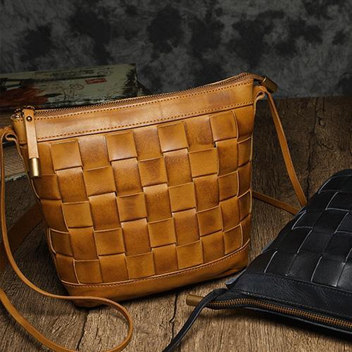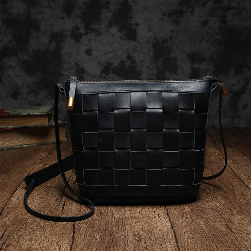 Design: Woven Genuine Leather Bucket Shoulder Crossbody Bags Purses In Stock: 3-5 Days To Process Order Include: A Bag Custom: None Material: Cowhide Color: Brown, Black Measures: 8.8 inch ( 16cm× 22cm× 10cm) Weight: 0.78 kg Slots: 1 zip main slot, 1 inner slot, 1 zip inner slot Style: Handmade Leather Bag Note: