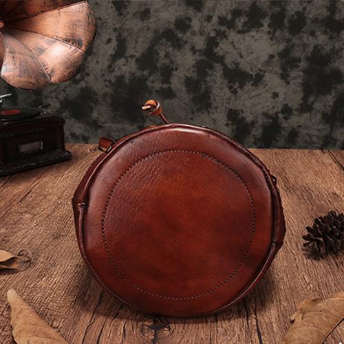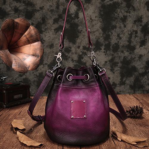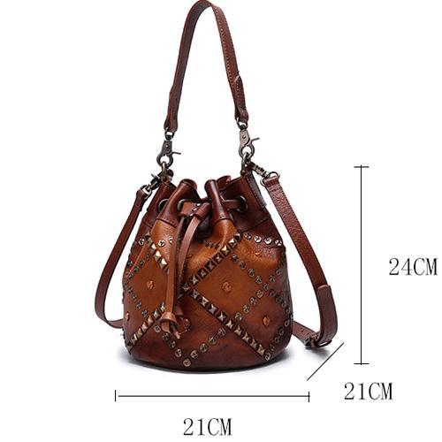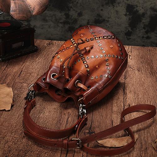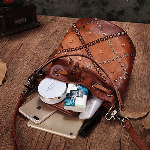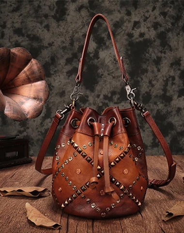 Brown Leather Womens Bucket Handbag Shoulder Bag Studded Western Leather Shoulder Barrel Bag Purse
