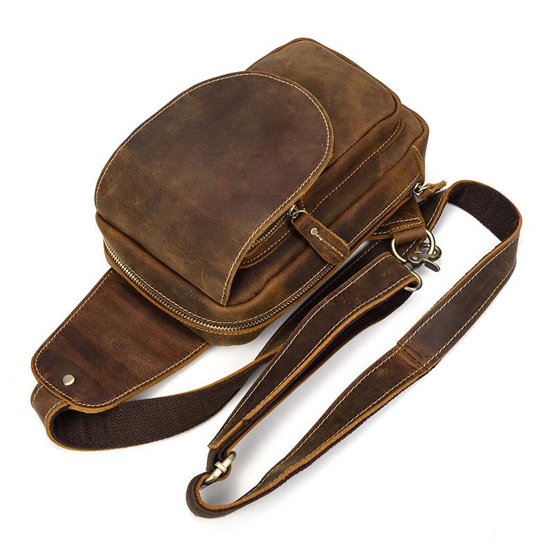 Design: Dark Brown Leather Men's 8 inches Brown Sling Bag Chest Bag One Shoulder Backpack For Men