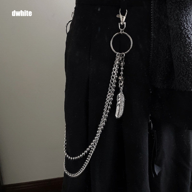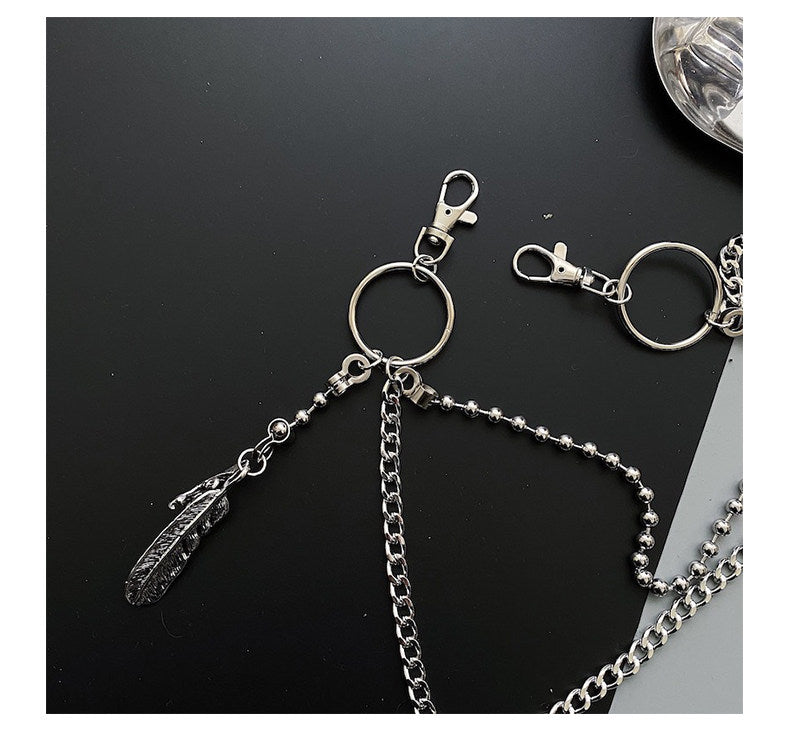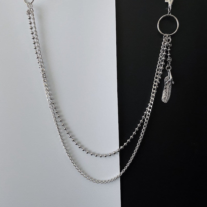 Introduce a touch of effortless edge and delicate contrast with our Beaded Wallet Chain, a sleek and versatile accessory designed for the style-savvy individual. This refined Double Wallet Chain features a 65cm outer strand of fine alloy chain paired with a 50cm inner strand of polished stainless steel beads, creating a layered look that balances industrial structure with subtle texture. The design is elevated with a graceful feather charm suspended near the clasp, adding a hint of lightness, symbolism, and bohemian flair. This versatile Ball Wallet Chain adapts seamlessly to a variety of looks, from urban casual to elevated streetwear, making it the perfect accent for fashion enthusiasts who appreciate both detail and versatility.