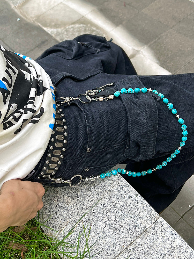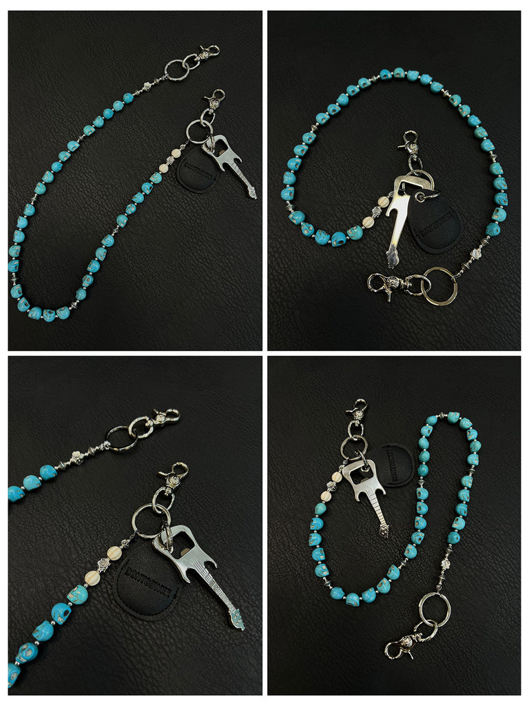 Unleash your inner rock spirit with our extraordinary Skull Head Wallet Chain, a masterpiece that blends dark aesthetics with musical passion. This 78cm chain features strikingly carved turquoise stone skulls complemented by alloy plum blossom beads, culminating in a distinctive electric guitar charm. This Skull Wallet Chains collection piece is an essential statement for metal and rock enthusiasts who demand both style and symbolism.