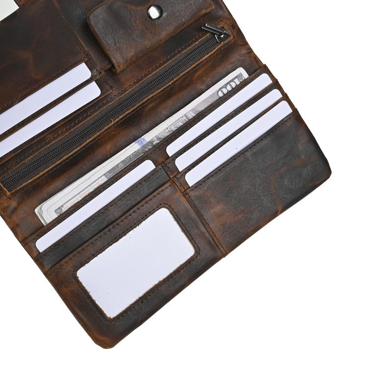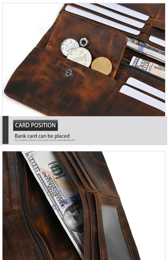 This spacious Leather Wallet with Buckle provides ample organization for those who carry multiple essentials. Featuring 6 card slots, a clear ID window, a flip-top coin pocket, a zippered security compartment, and a full-length bill slot, this Buckle Mens Wallets long version keeps your belongings neatly arranged while the sturdy buckle closure prevents accidental spills.