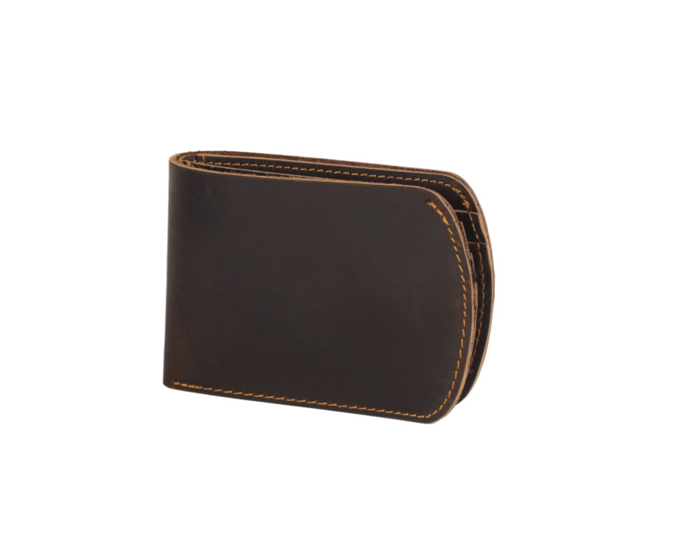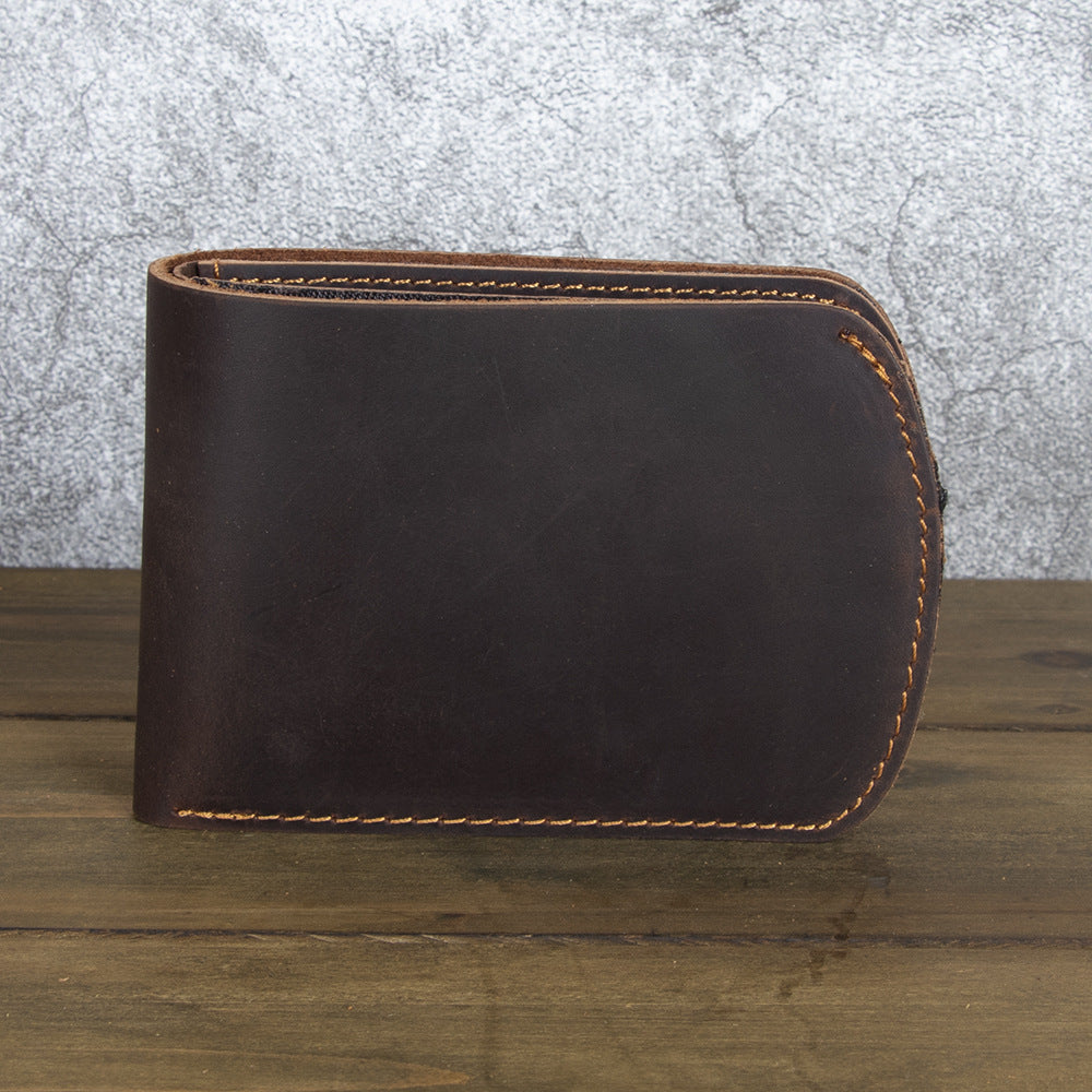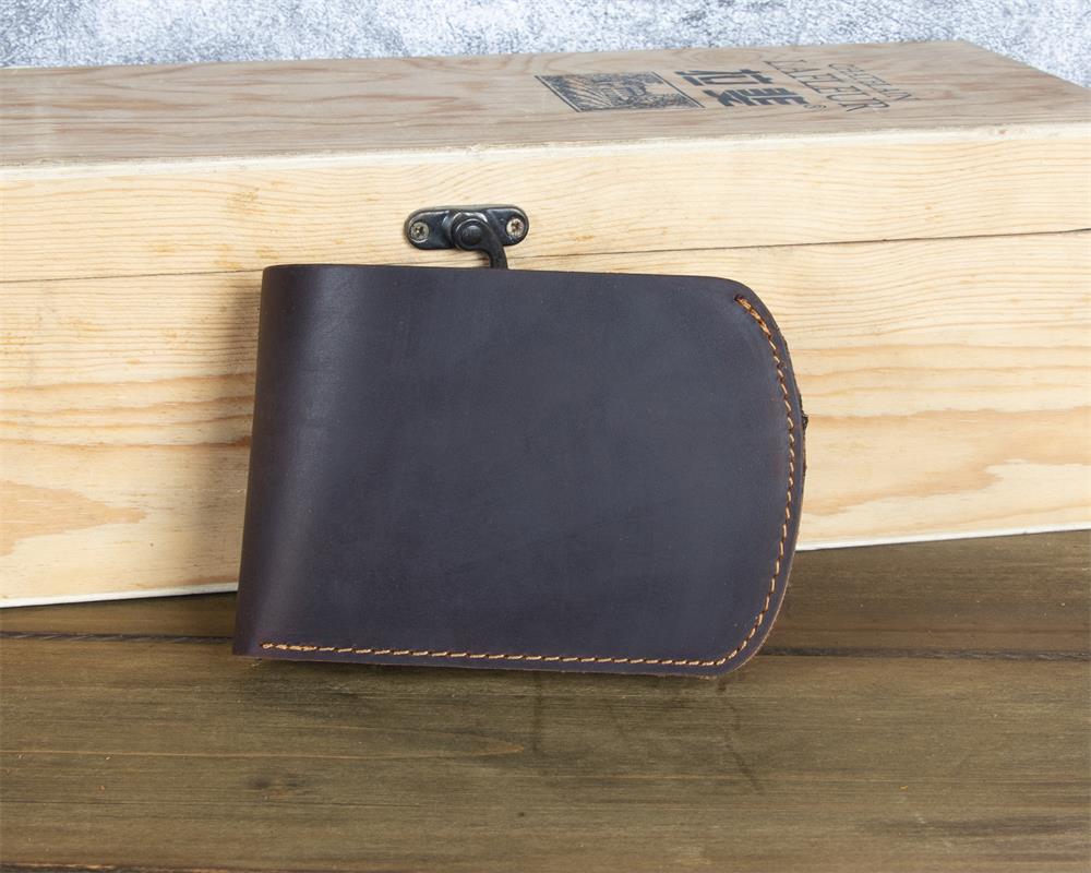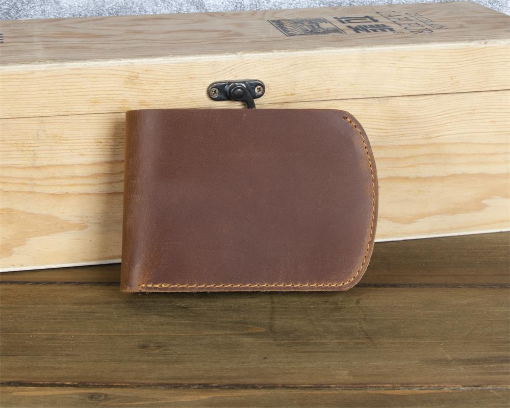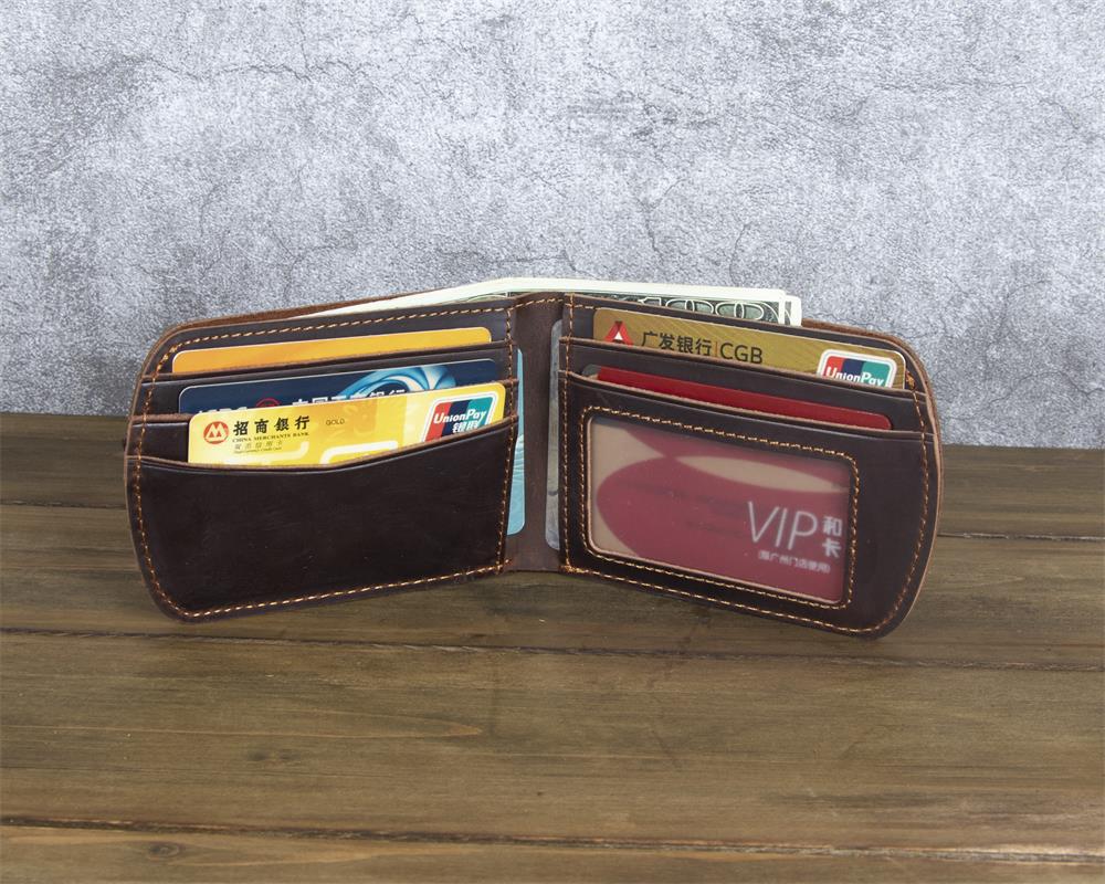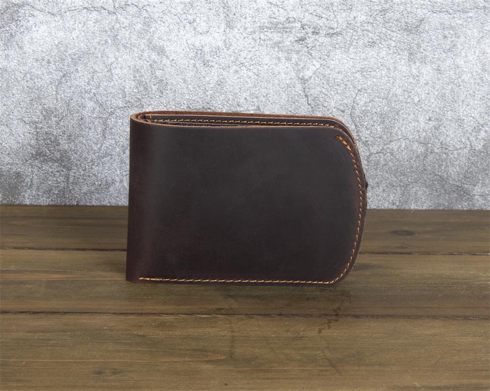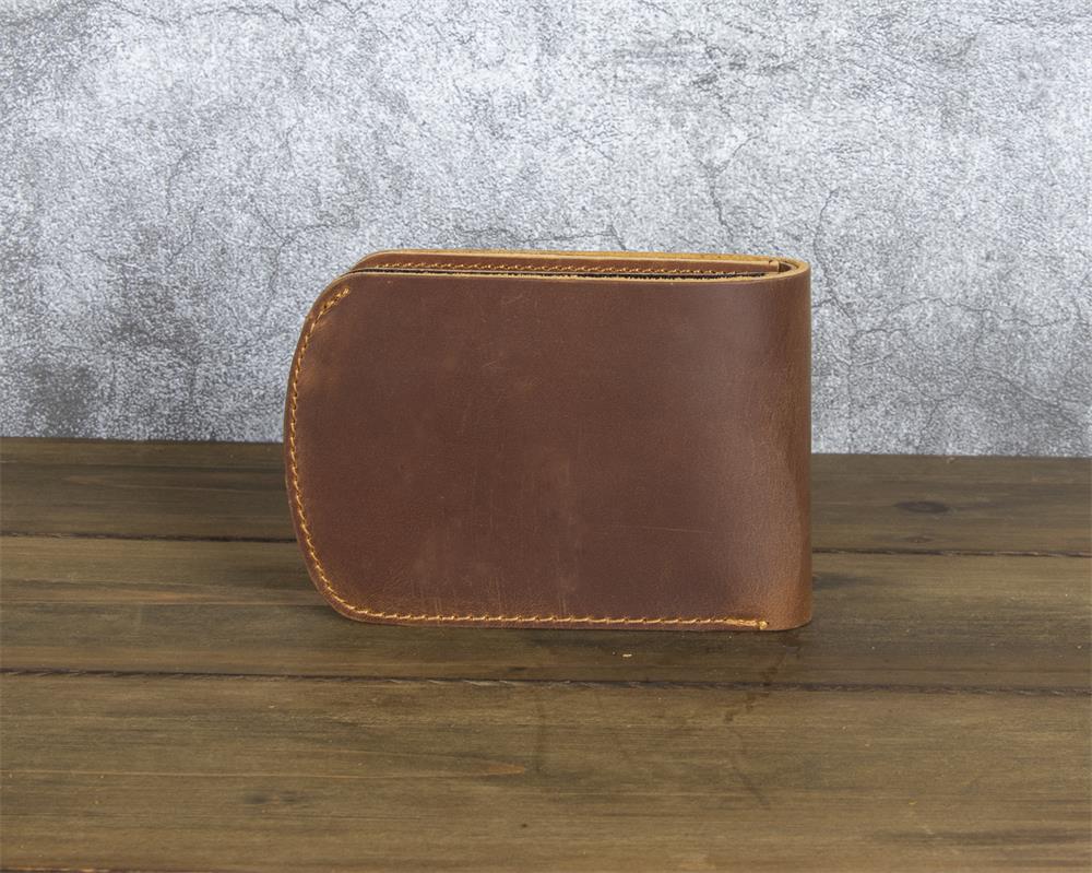What truly sets this Brown Leather ID Billfold Wallet apart is its elegant curved silhouette. Unlike traditional rectangular wallets with sharp corners, this design features a graceful semi-circular edge along the opening side, creating a smooth, organic shape that stands out visually and feels comfortable in hand. The interior is intelligently organized with six card slots and a clear ID window, providing ample storage while maintaining an exceptionally slim profile. The crazy horse leather develops a beautiful patina over time, ensuring your wallet becomes uniquely yours with every use.