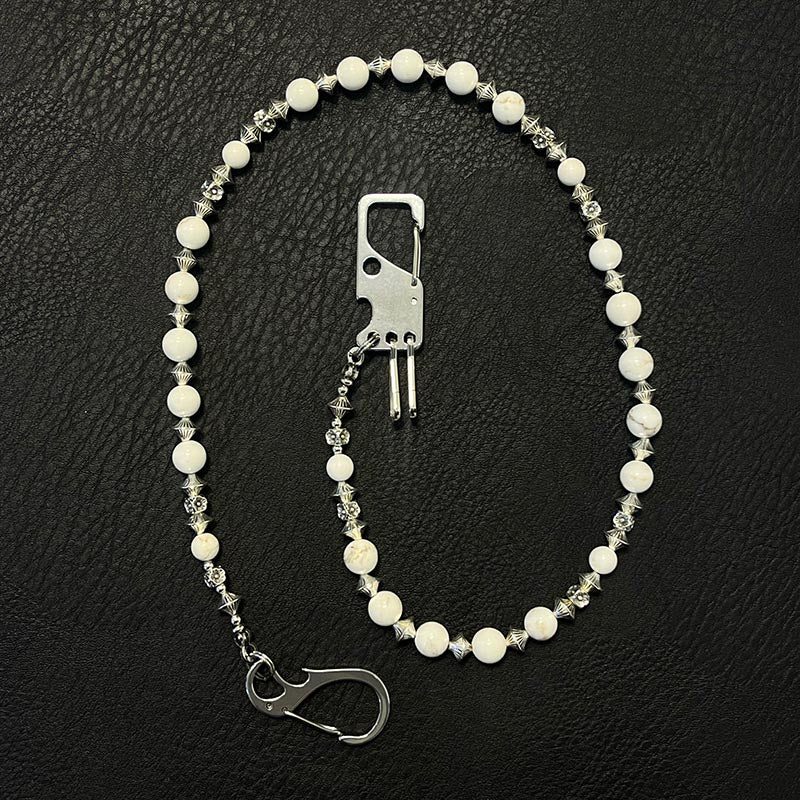 Discover a new dimension of alternative fashion with our stunning beaded Wallet Chain, where natural beauty meets urban edge. This 78cm masterpiece features genuine white howlite stone beads as its foundation, artfully accented with UFO-shaped spacer beads and delicate plum blossom beads that create a captivating visual rhythm. The pristine white and silver palette offers a fresh, sophisticated take on chain accessories, while the four functional keyrings near the clasp provide both practicality and style. This exceptional beaded pants chain redefines what a wallet chain can be �blending elegance with attitude in perfect harmony.