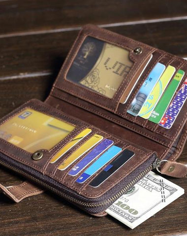 Style: Vintage Brown Leather Men's Bifold Long Wallet Cool Zipper Long Wallet Clutch For Men