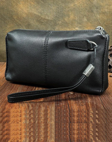 Design: Black Leather Mens Long Wallet Suede Leather Wallet Black Wristlet Clutch Wallet for Men