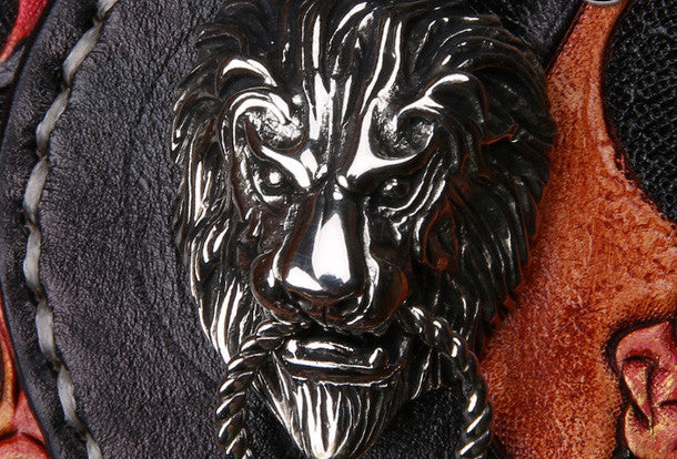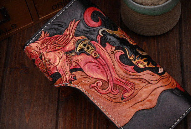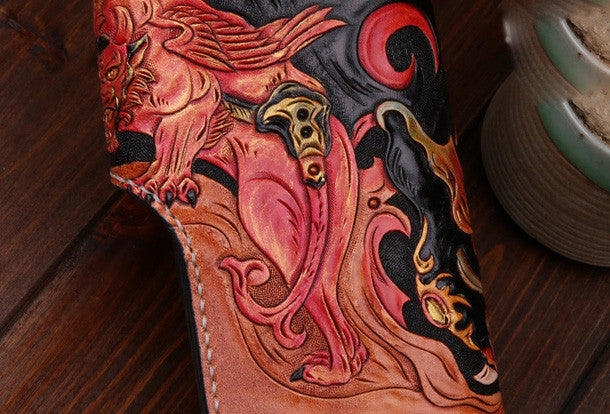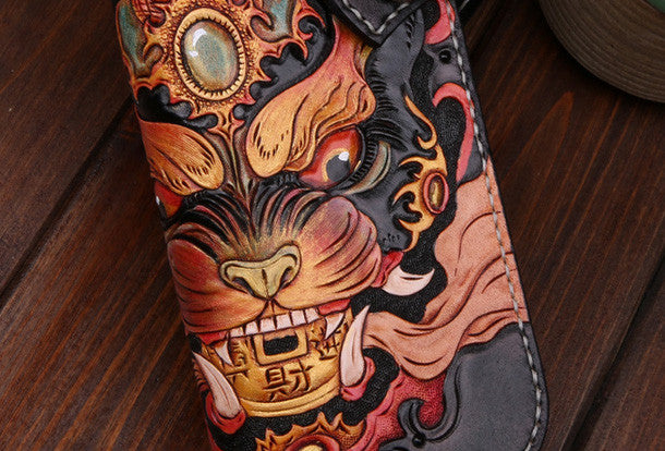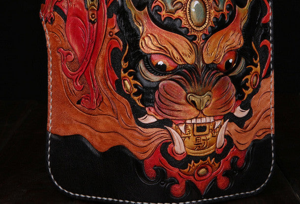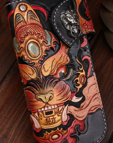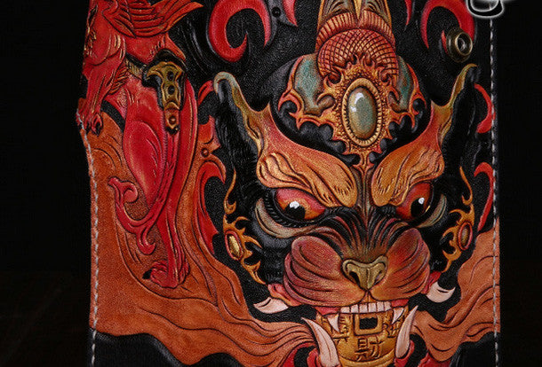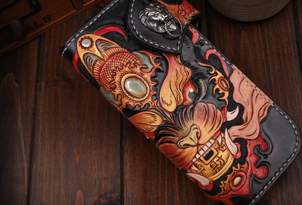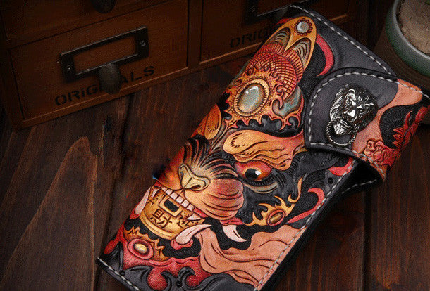 Handmade leather Long biker trucker wallet leather chain men Black Carved Tooled wallet