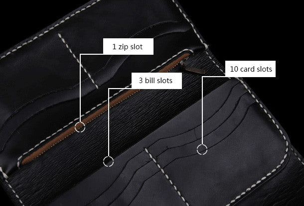 Slots:?3?full size bill slots, 10?card holders, 1 zip?slot