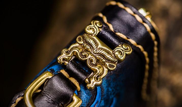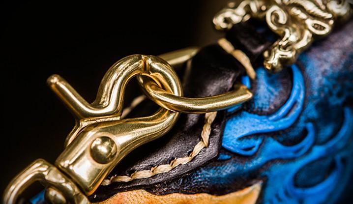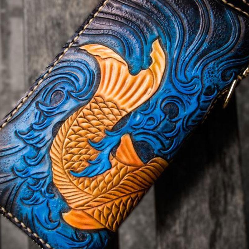 Handmade Leather Men Tooled Carp Cool Biker Leather Wallets Long Chain Wallets for Men