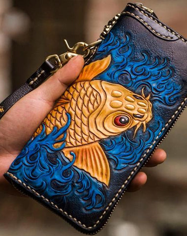 Design: Handmade Leather Men Tooled Carp Cool Leather Wallet Long Phone Wallets for Men