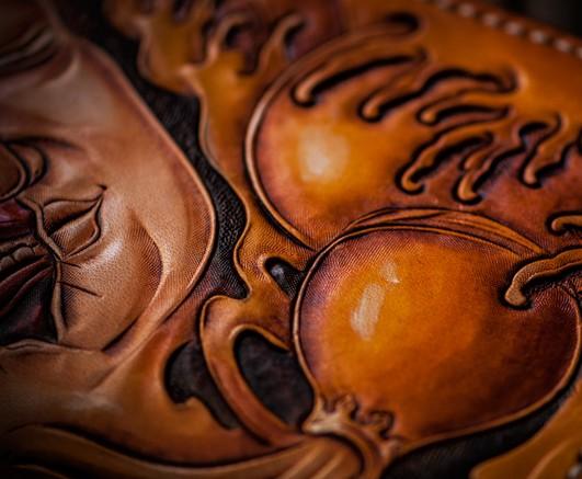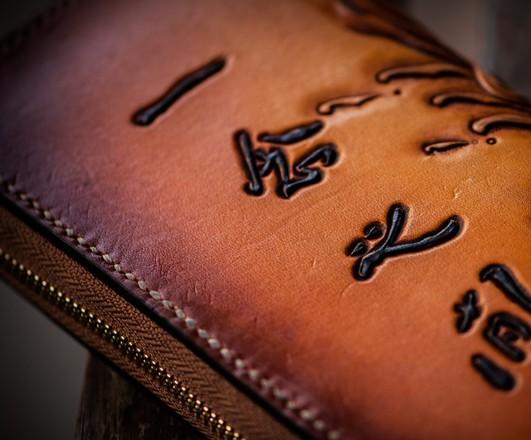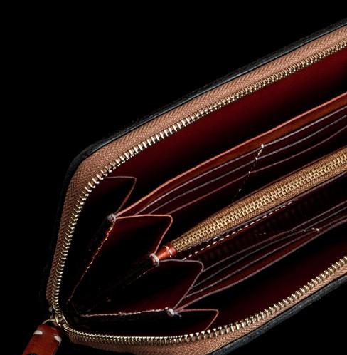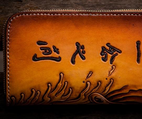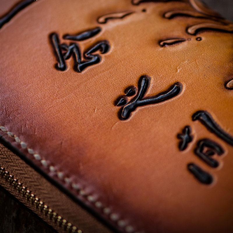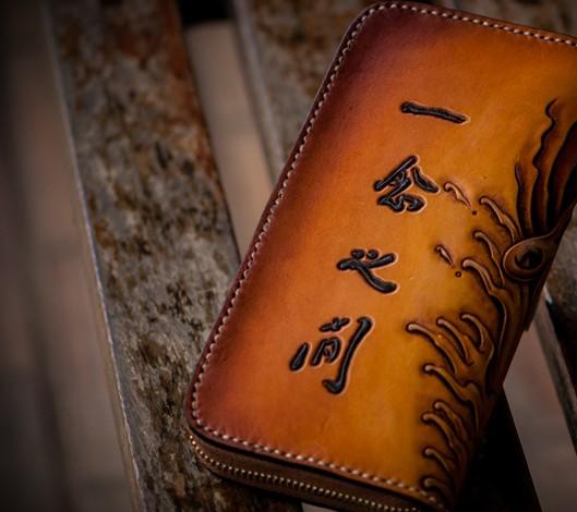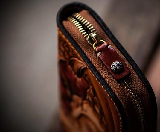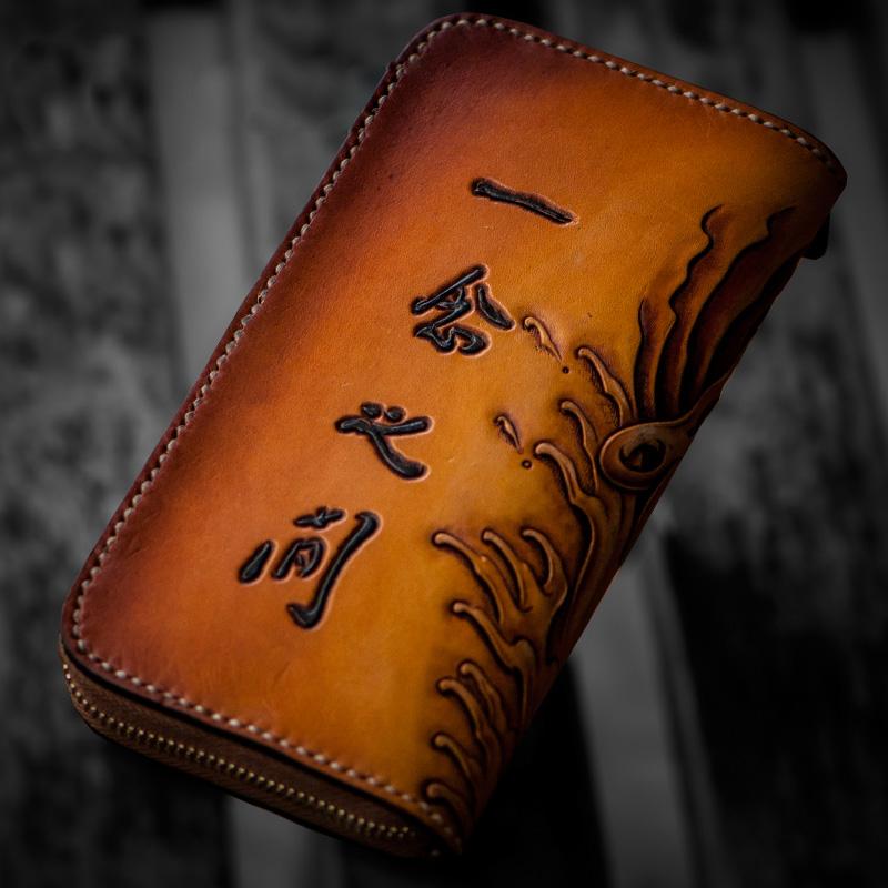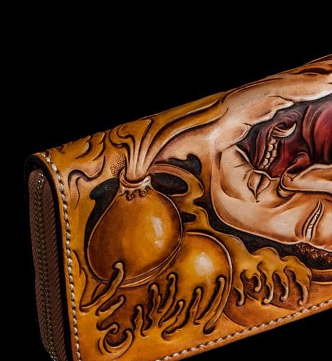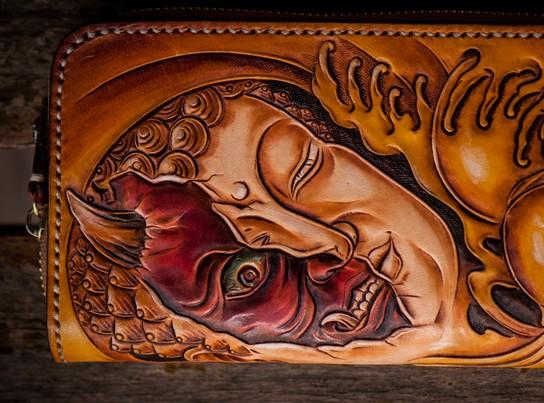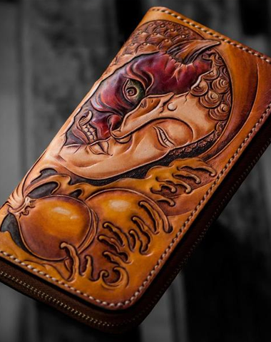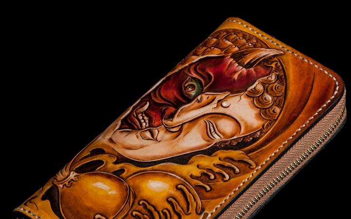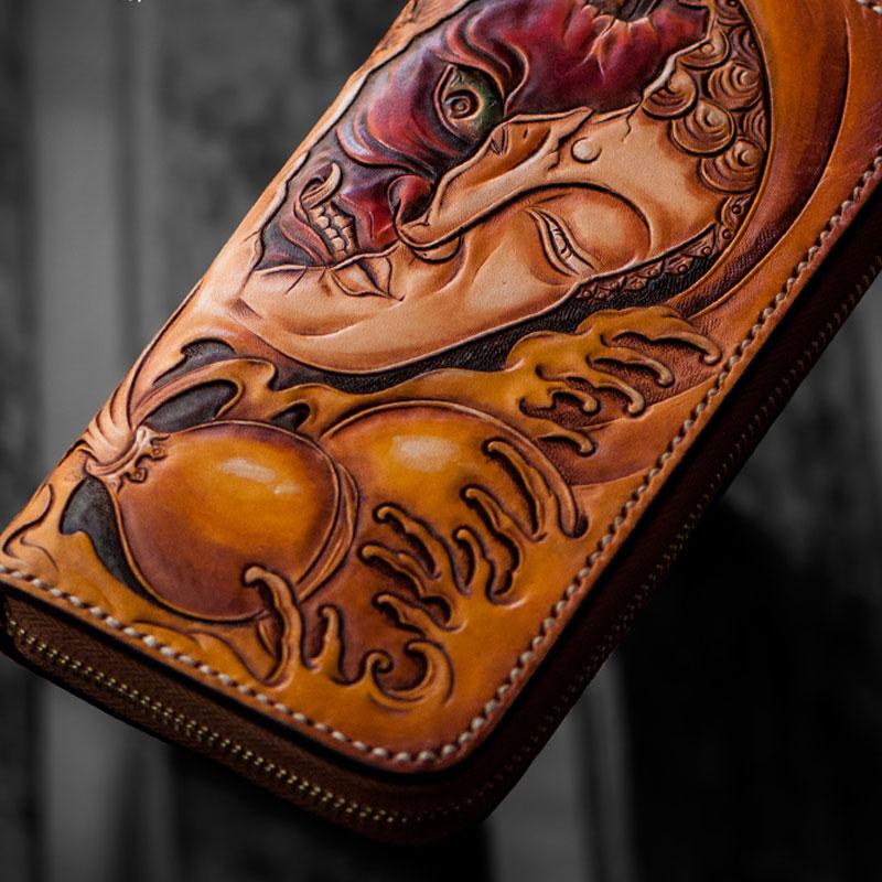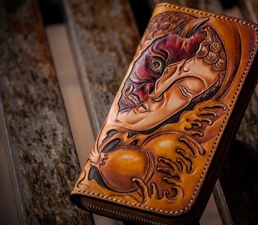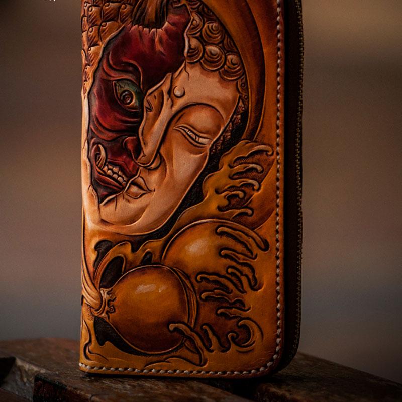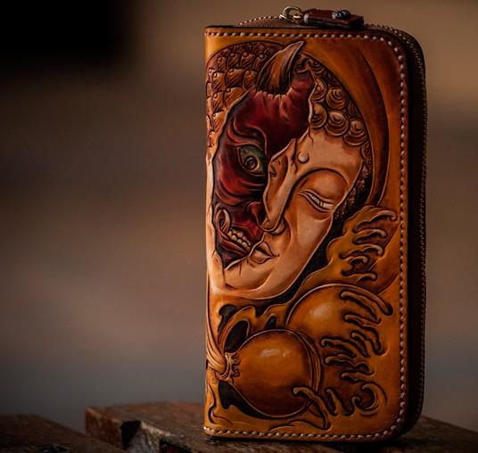 Design: Handmade Leather Mens Clutch Wallet Cool Buddha&Demon Tooled Wallet Long Zipper Wallets for Men