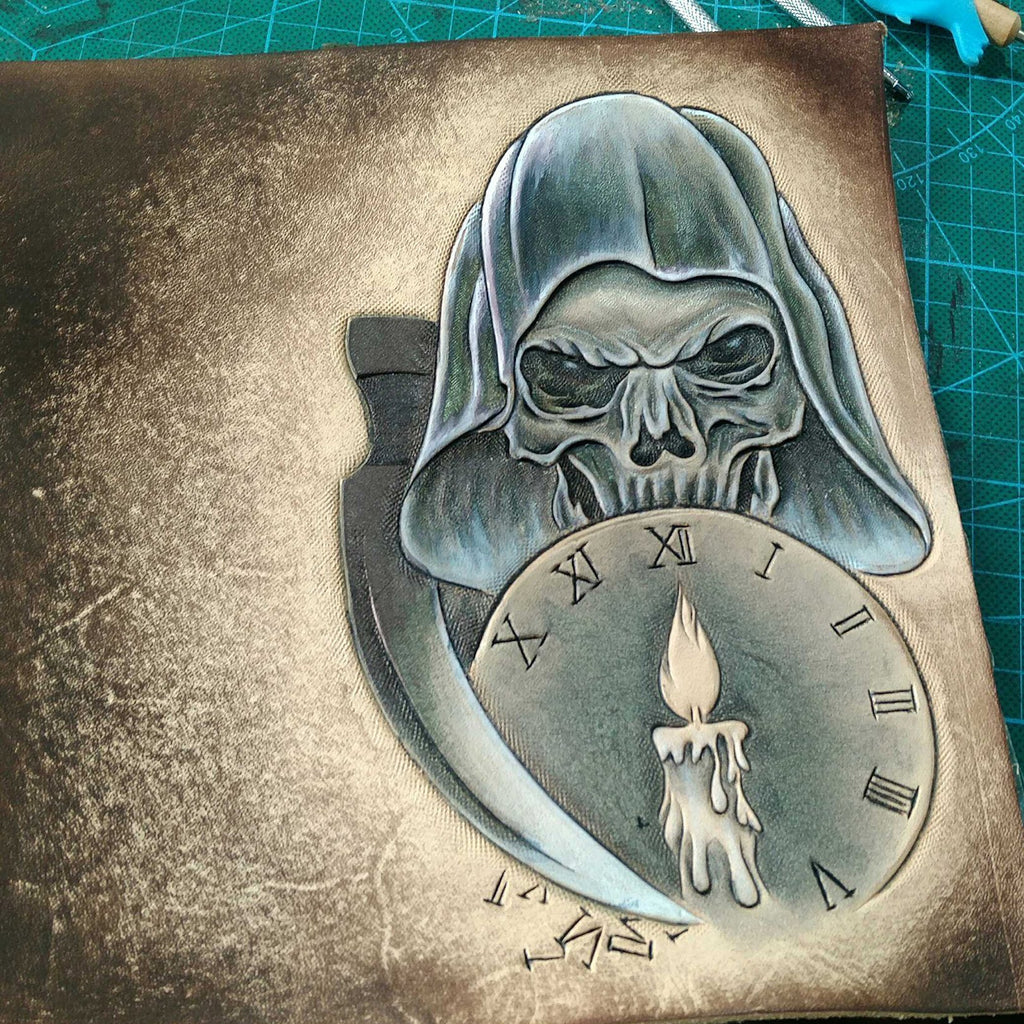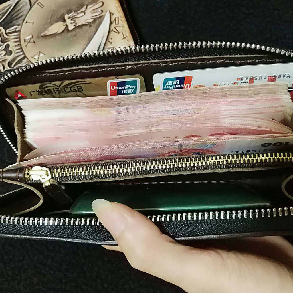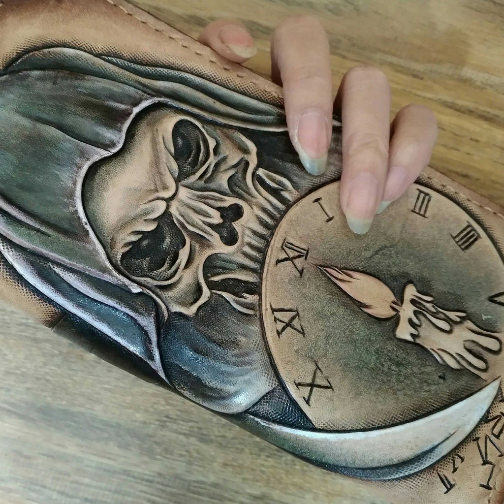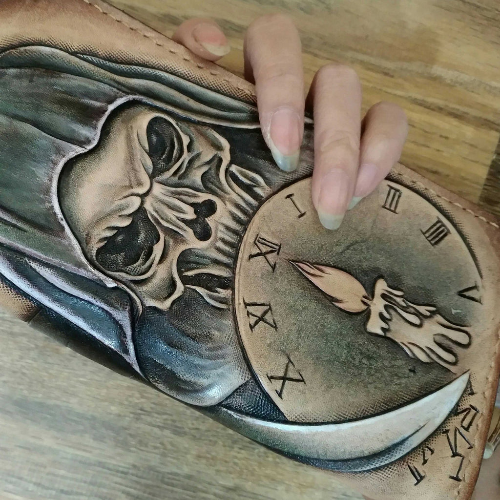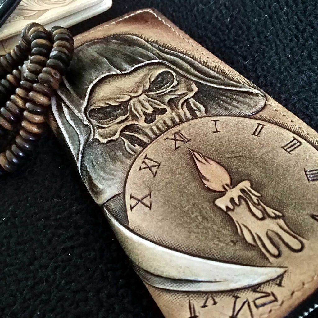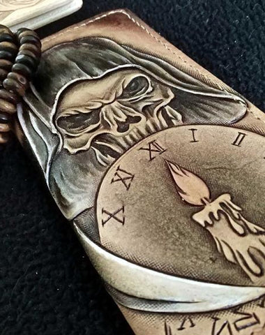 Design: Handmade Leather Skull Death Tooled Mens Long Wallet Cool Leather Wallet Clutch Wallet for Men
