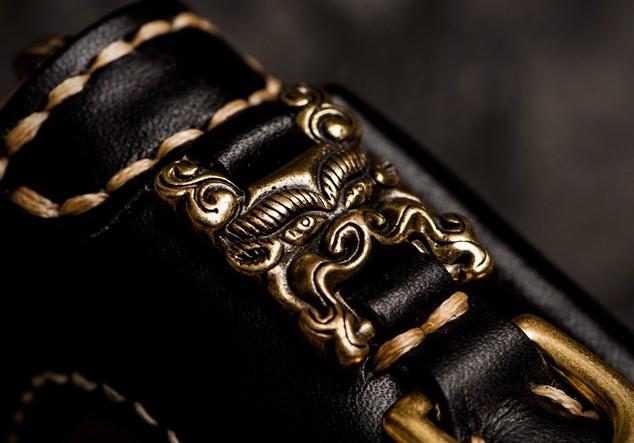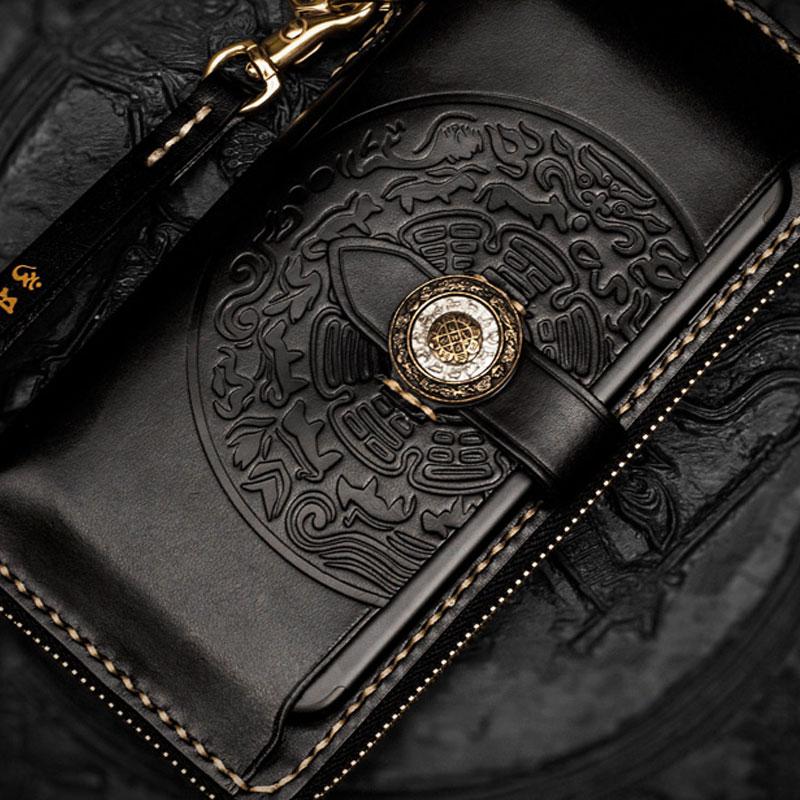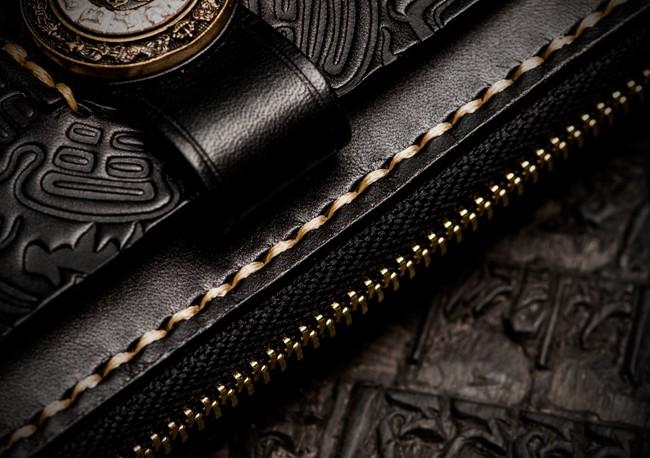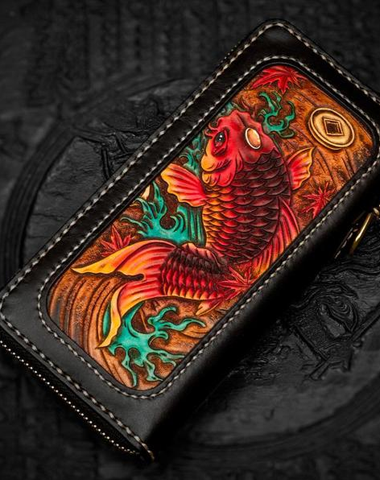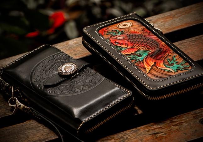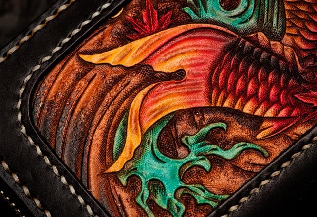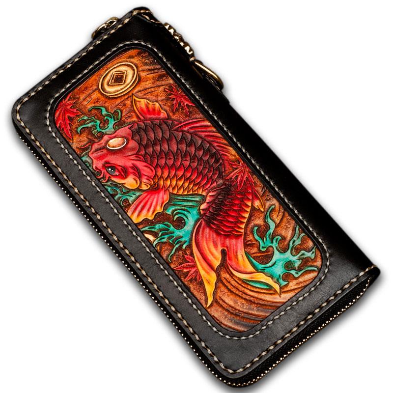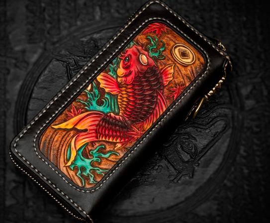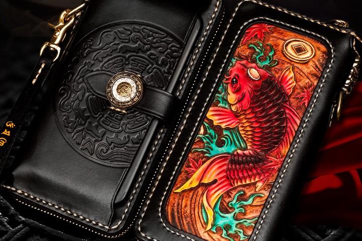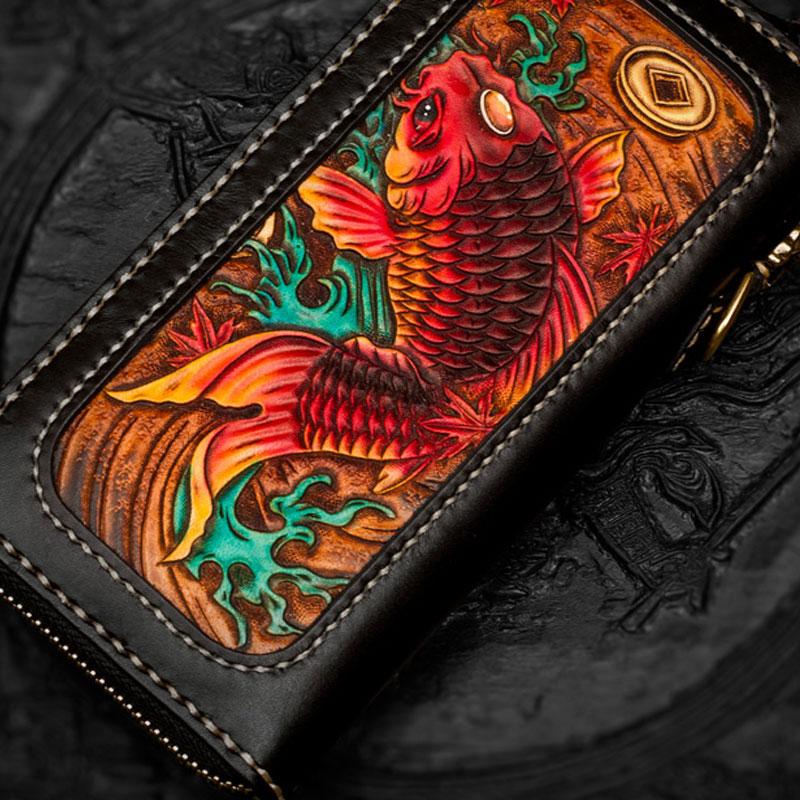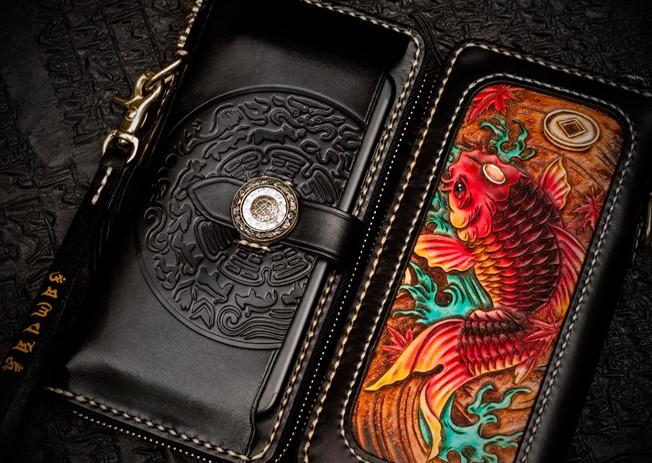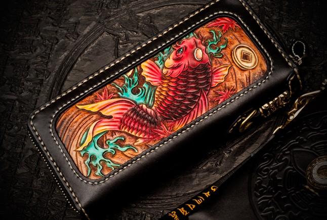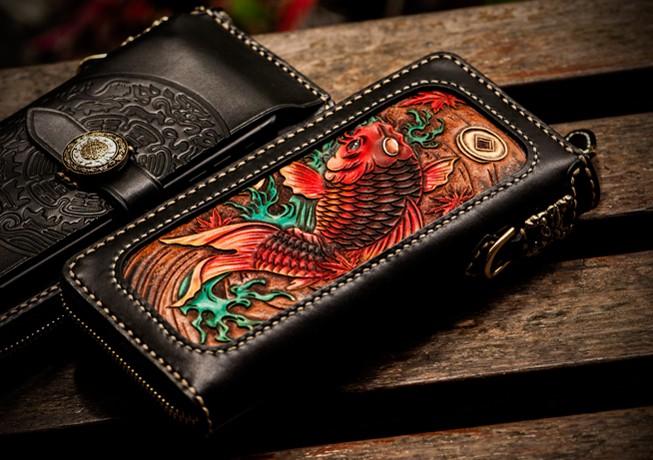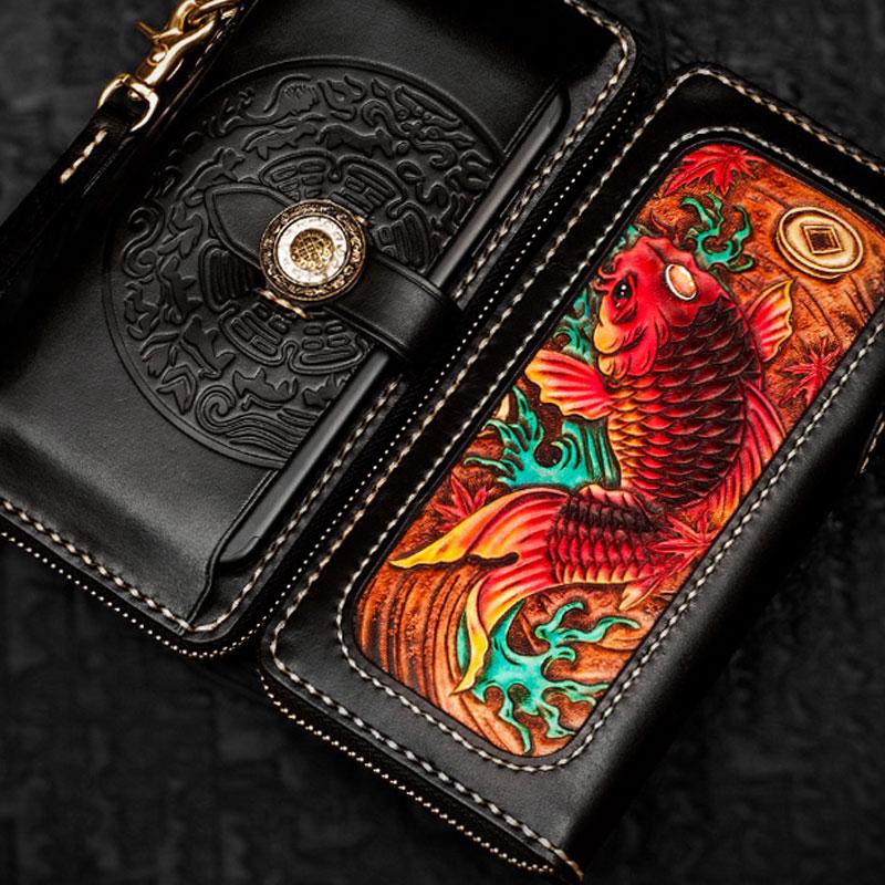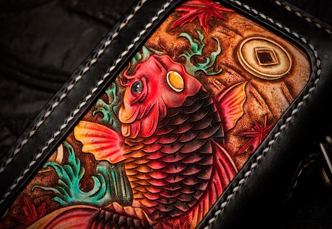Style: Handmade Leather Tooled Carp Chain Wallet Mens Biker Wallet Cool Leather Wallet Long Phone Wallets for Men