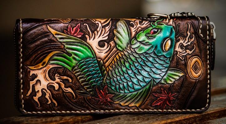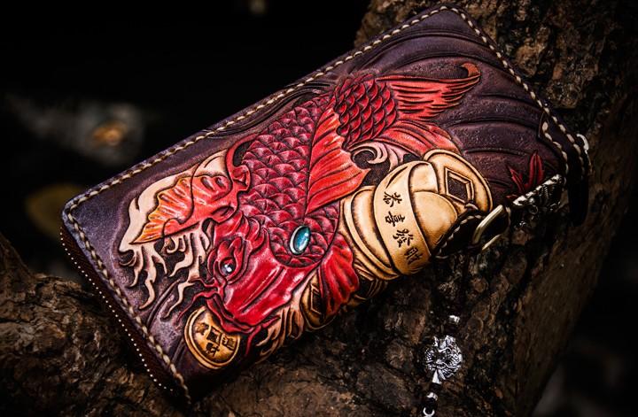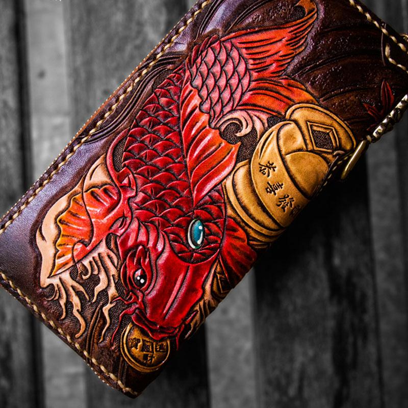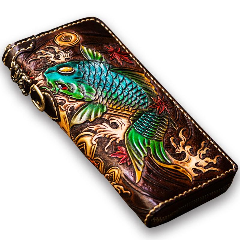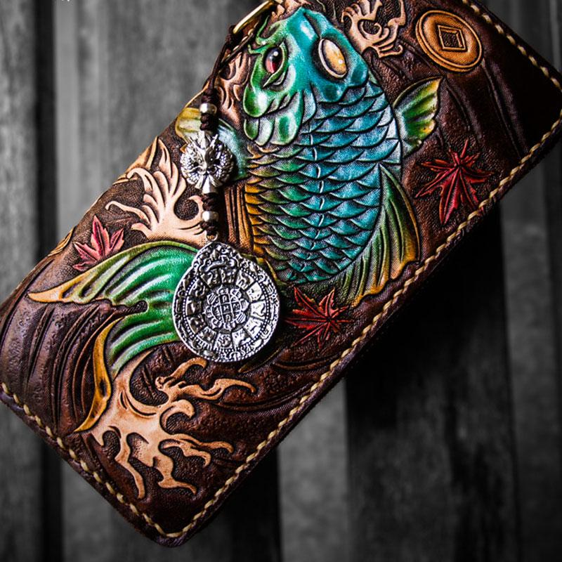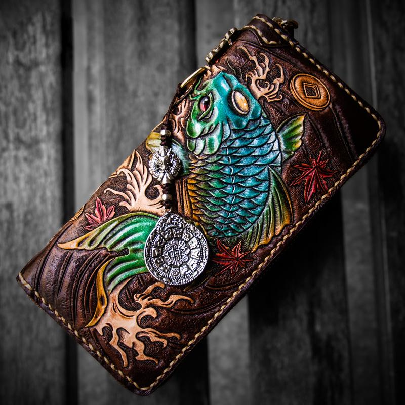 Design: Handmade Leather Tooled Carp Mens Chain Biker Wallet Cool Leather Wallet Long Phone Wallets for Men
