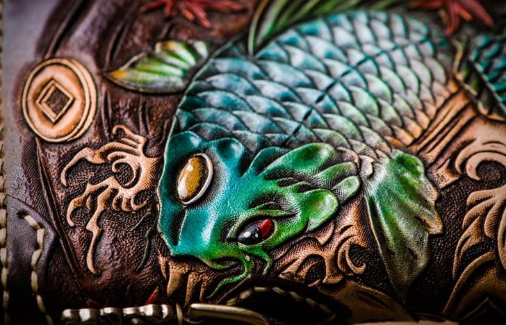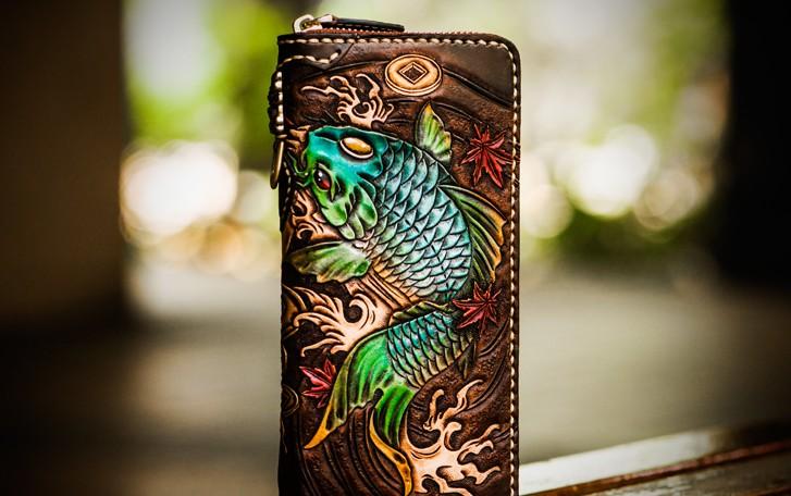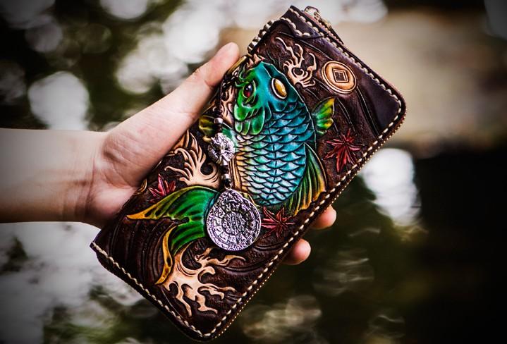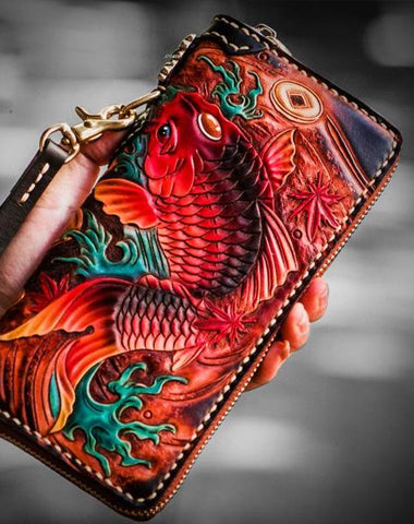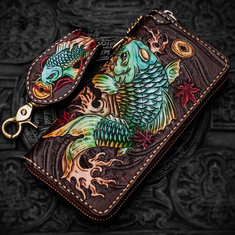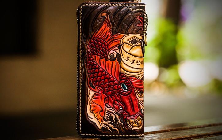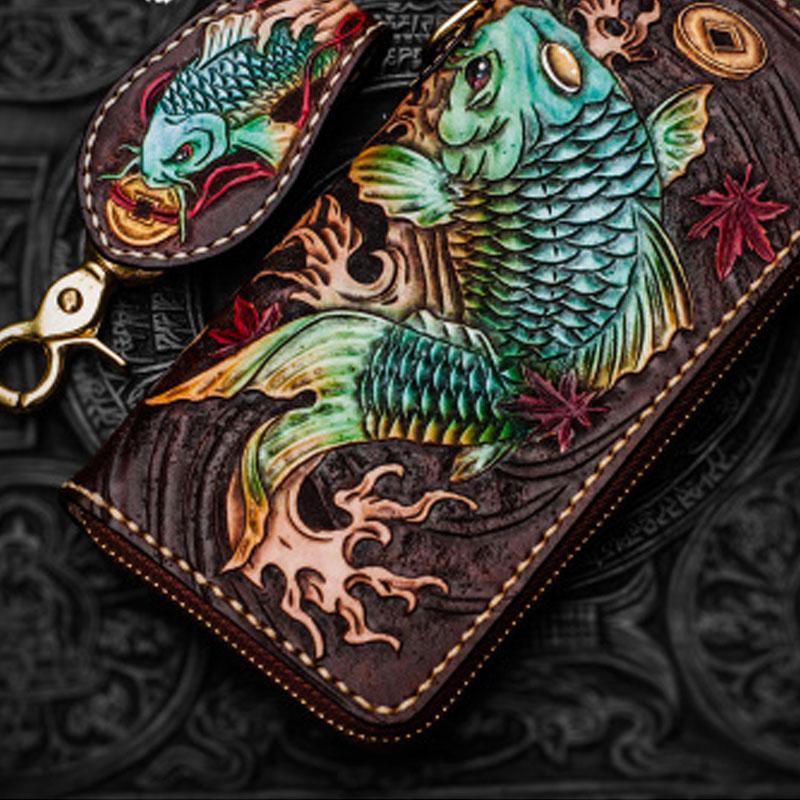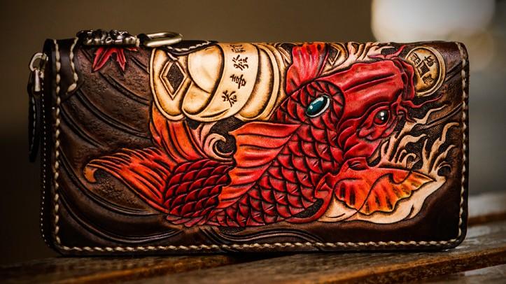 Design: Handmade Leather Tooled Carp Mens Chain Biker Wallet Cool Leather Wallet Long Phone Wallets for Men
