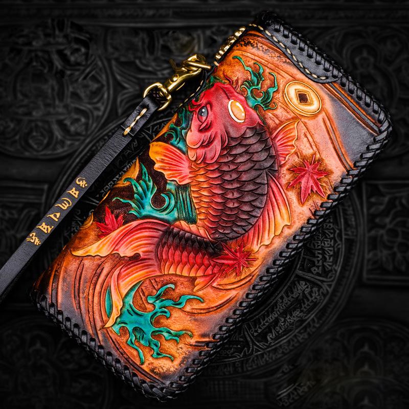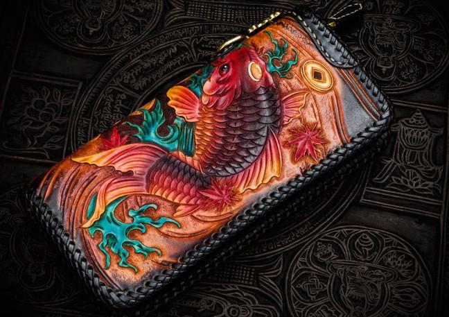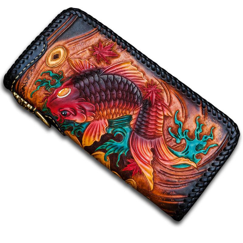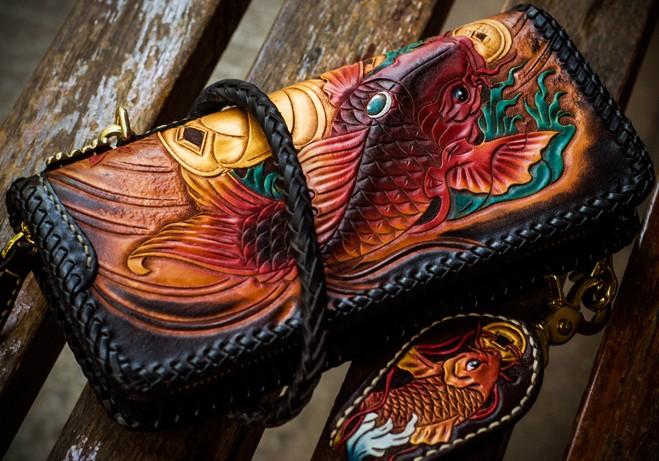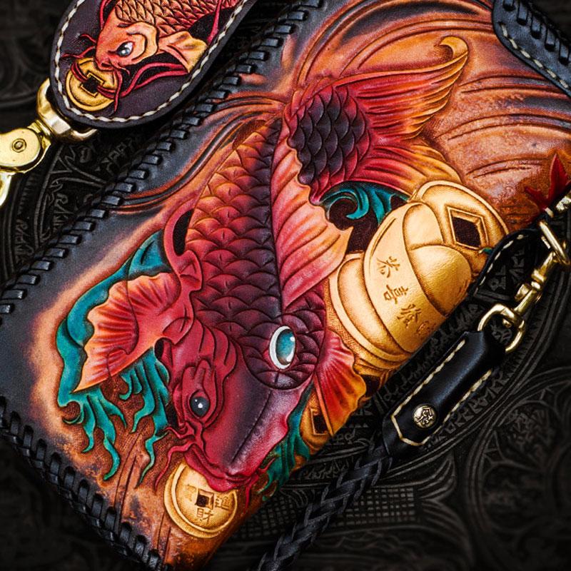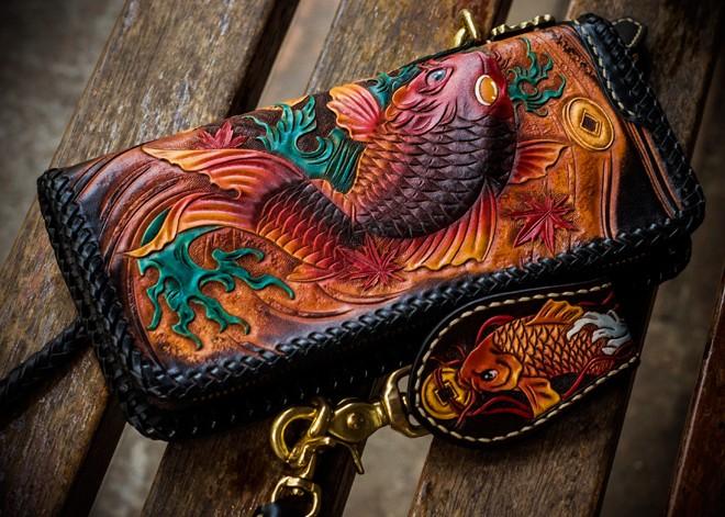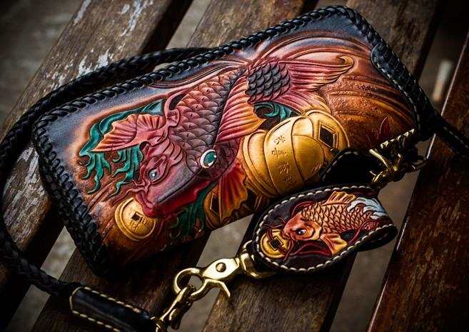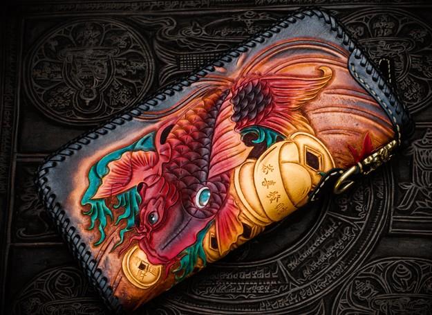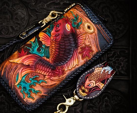 Design: Handmade Leather Tooled Carp Mens Chain Biker Wallet Cool Leather Wallet Long Phone Wallets for Men