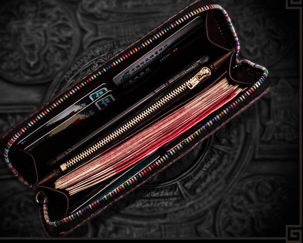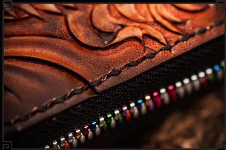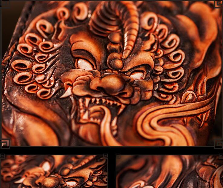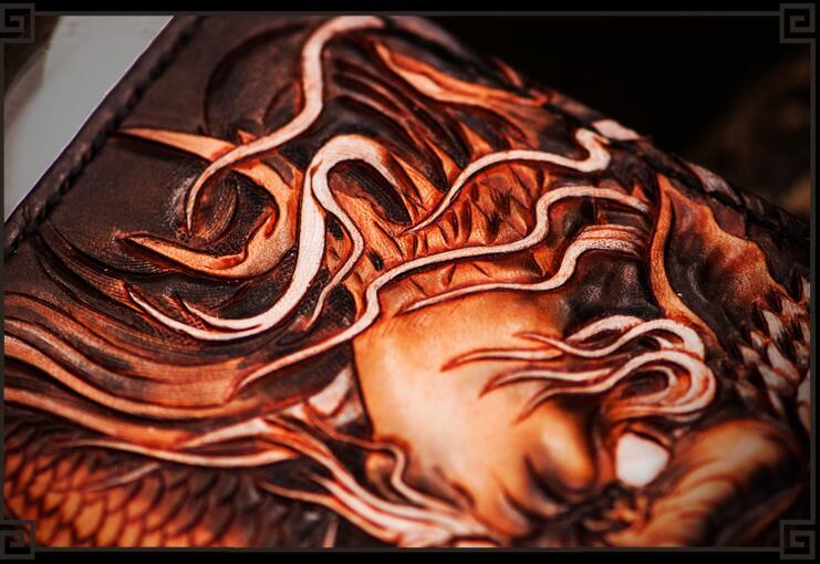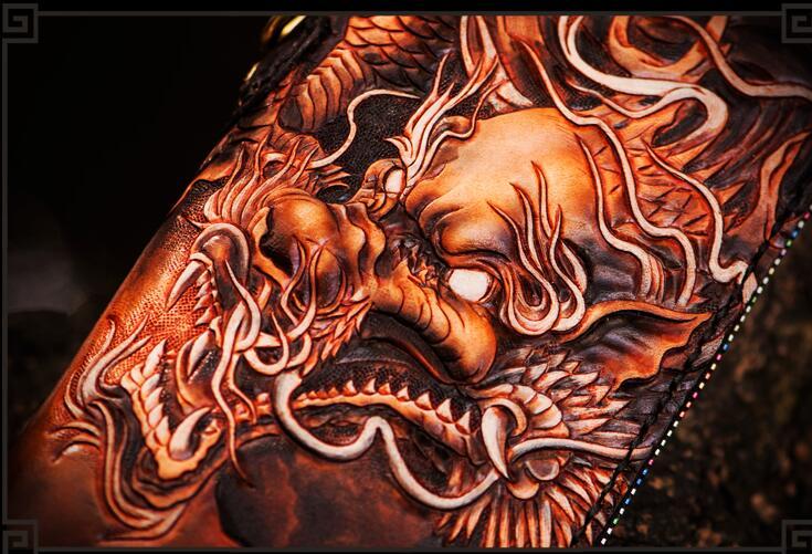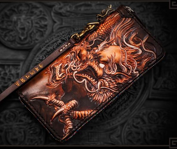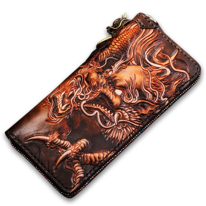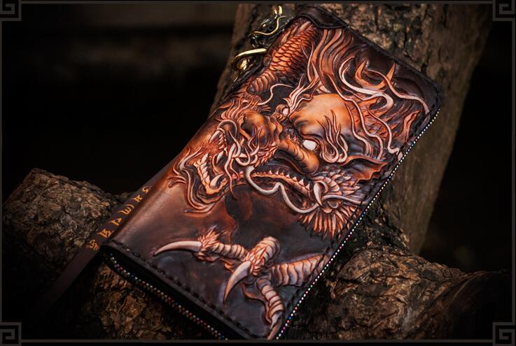 Design: Handmade Leather Tooled Chinese Dragon Mens Chain Biker Wallet Cool Leather Wallet Long Phone Wallets for Men