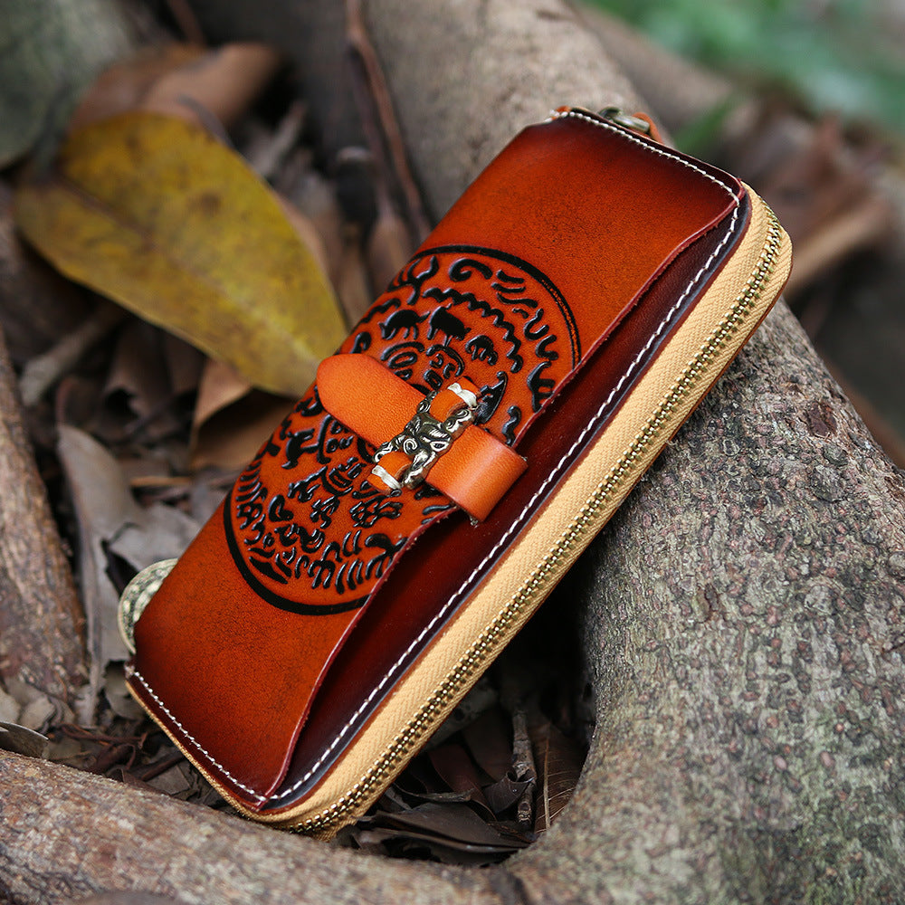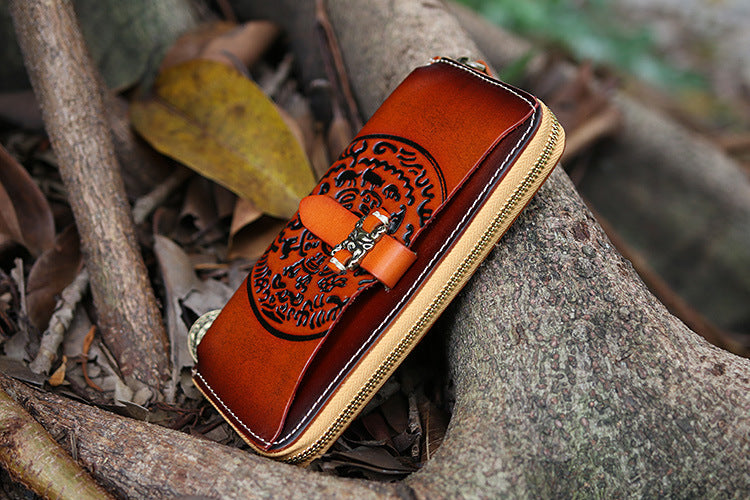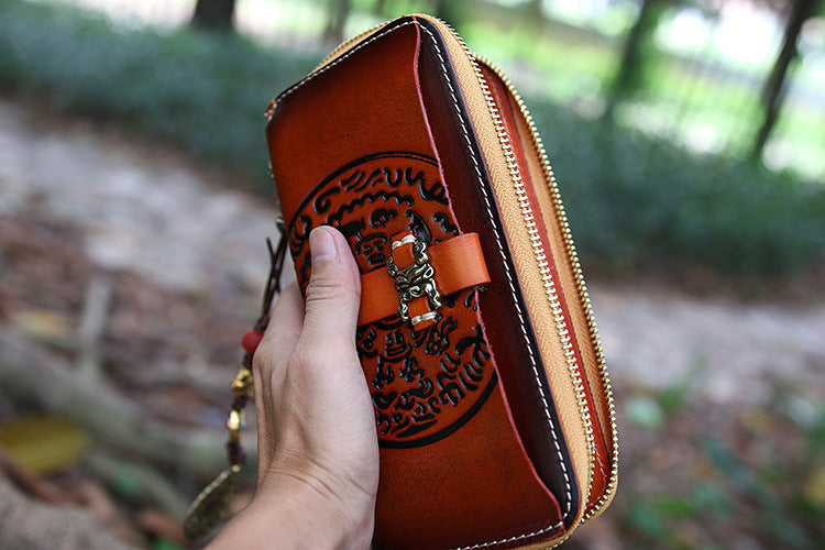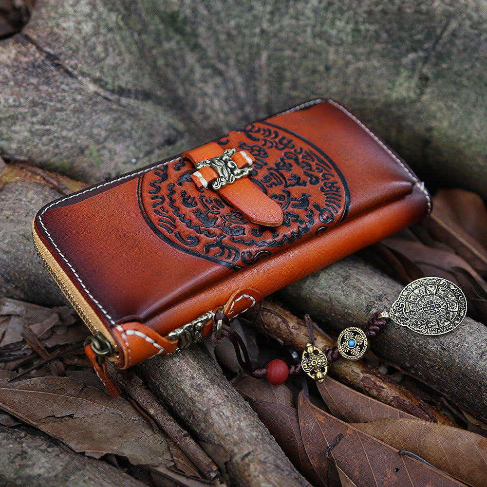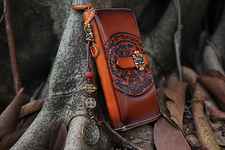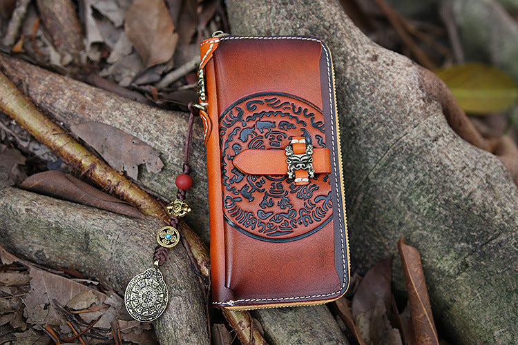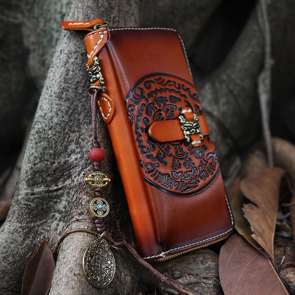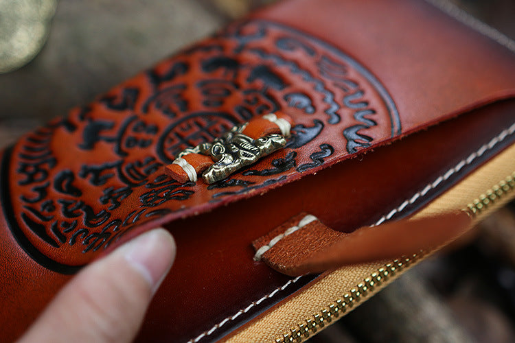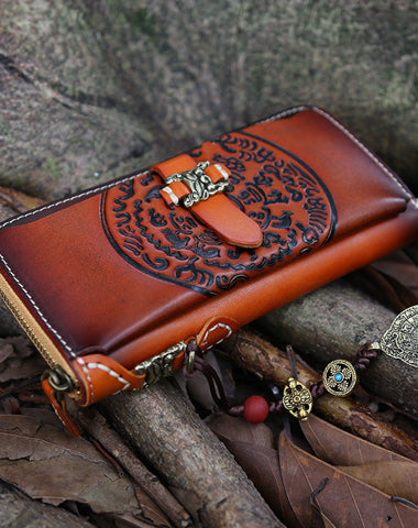 Design: Handmade Leather Tooled Tibetan Totem Long Wallet Cool Zipper Clutch Wristlet Wallet for Men
