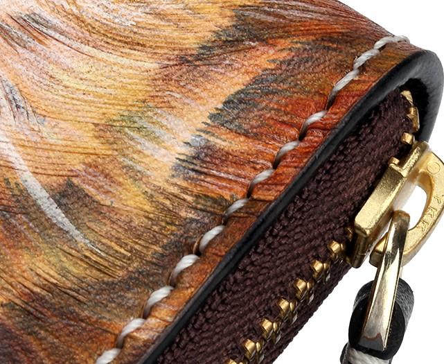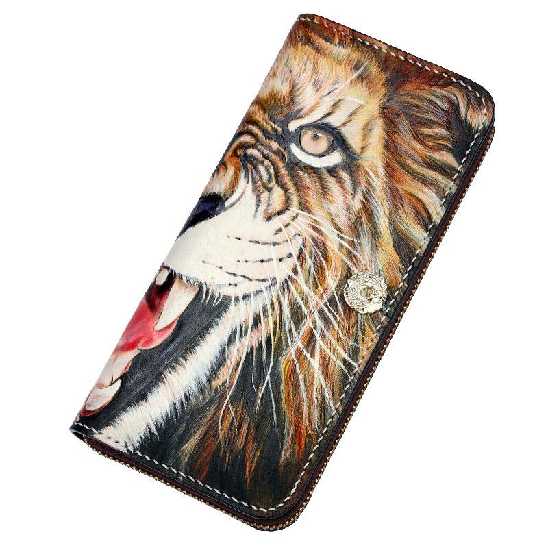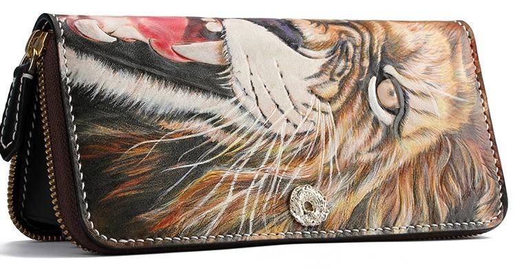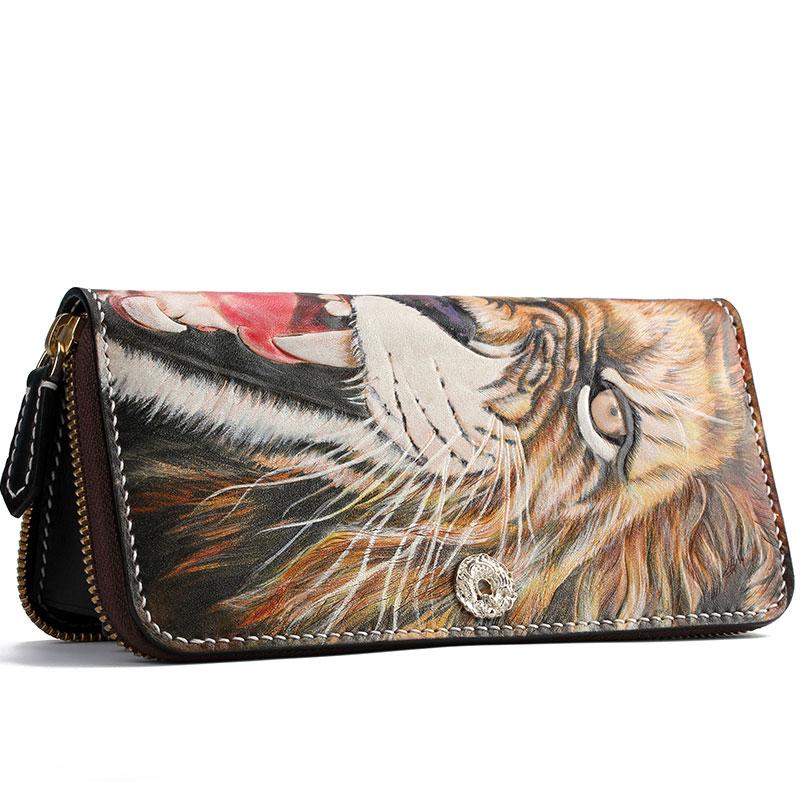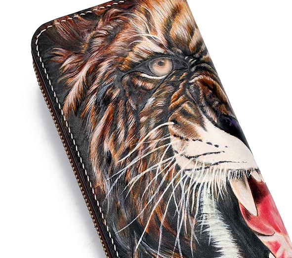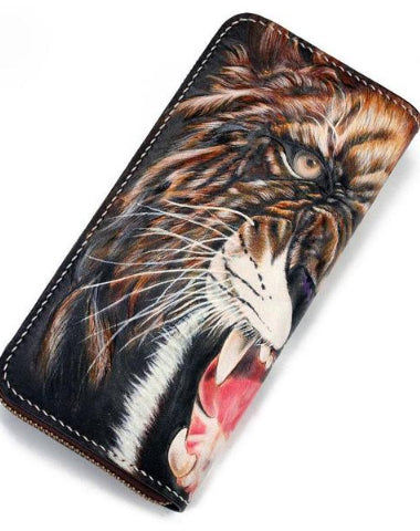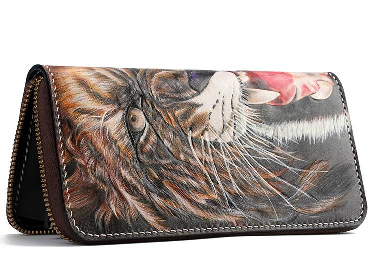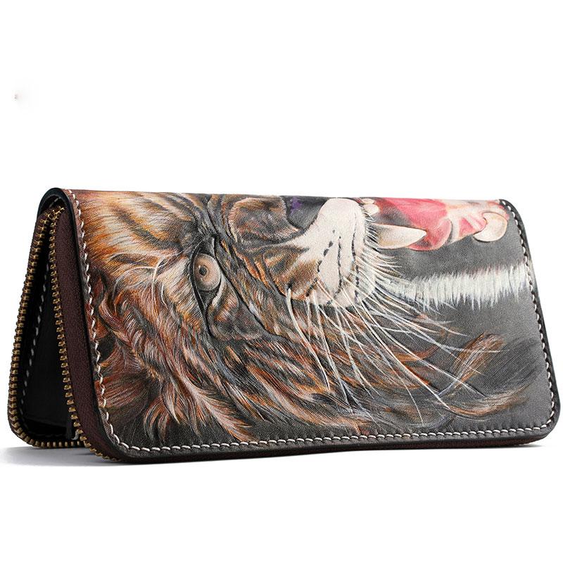 Style: Handmade Leather Tooled Tiger Mens Chain Zipper Biker Wallet Cool Leather Wallet Long Phone Wallets for Men