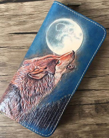 Design: Handmade Leather Wolf Tooled Mens Long Wallet Cool Leather Wallet Clutch Wallet for Men