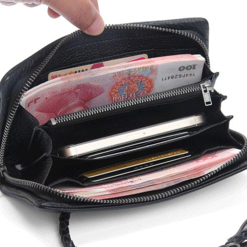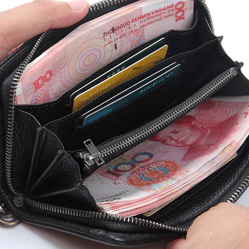 Slots: 2 full size bill slots, 6 card holders, 1 phone slot,1 zipper slot