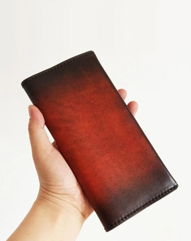 Style: Handmade Retro Mens Simple Light Beige Long Wallets Wine Red Bifold Long Wallet for Men