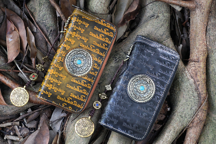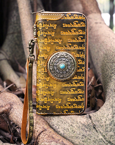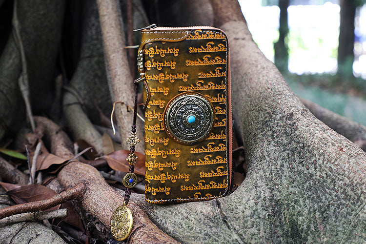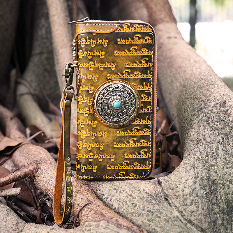 Design: Handmade Leather Tibetan Scriptures Long Wallet Cool Zipper Clutch Wristlet Wallet for Men