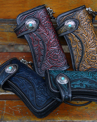 The second iteration of the leather tooled biker chain wallet elevates the concept of rugged sophistication. Handcrafted with meticulous attention to detail, this wallet comes in the same four rich colors: tan, blue, green, and red. The intricate Chinese Tang grass pattern is expertly tooled into the leather, creating a unique design that seamlessly blends traditional craftsmanship with modern aesthetics.