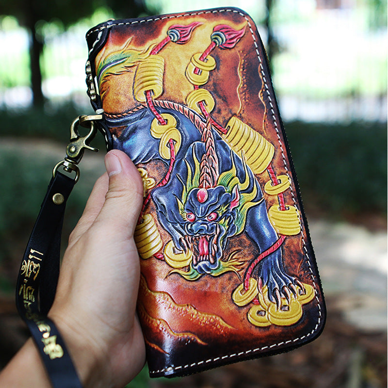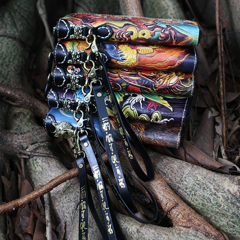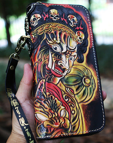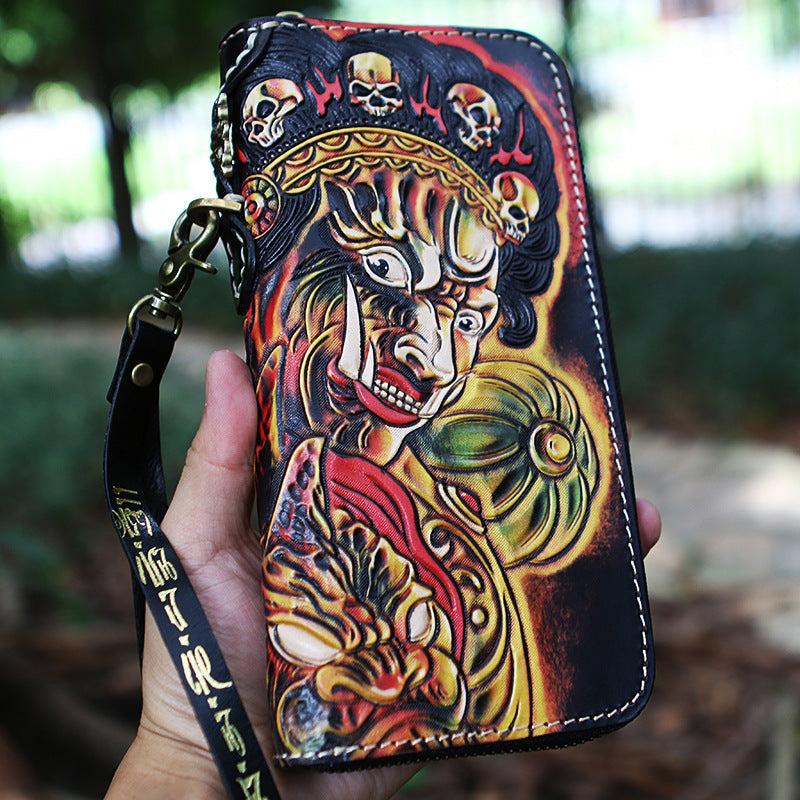 Handmade Tooled Mahākāla Leather Biker Chain Wallet Mens Long Wallet with Chain for Men