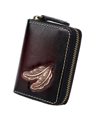Design: Around Zip Tooled Leather Card Wallet Mens Feather Zipper Card Holder for Men