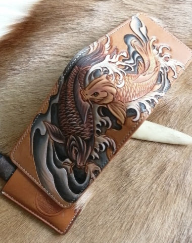 Style: Carp Leather Wallet ID Holder Wallet Mens Wallet with ID Window Carp Wallet Tooled Leather Wallet Card Wallet with ID Window