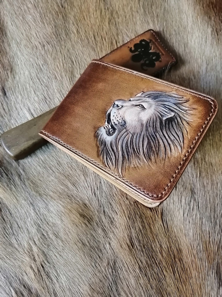 Style: Tooled Leather Wallet Card Wallet with ID Window Lion Leather Wallet ID Holder Wallet Mens Wallet with ID Window Lion Wallet