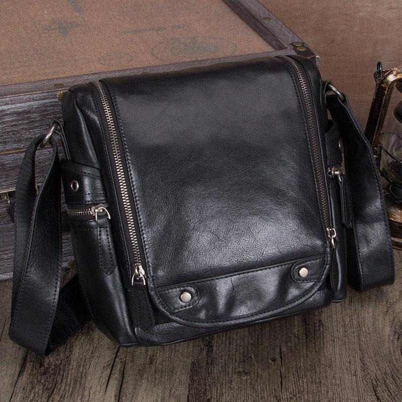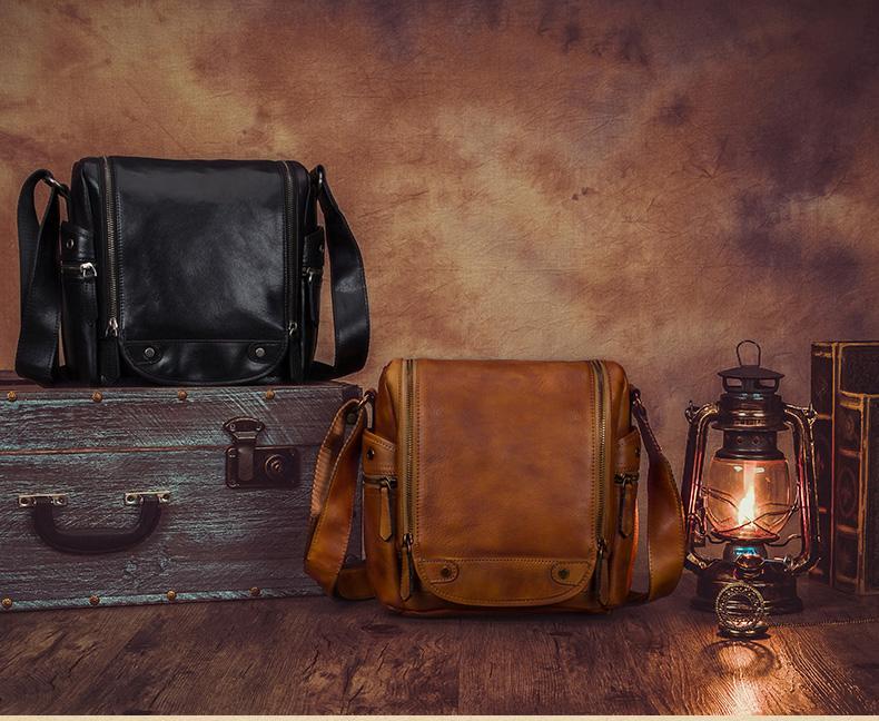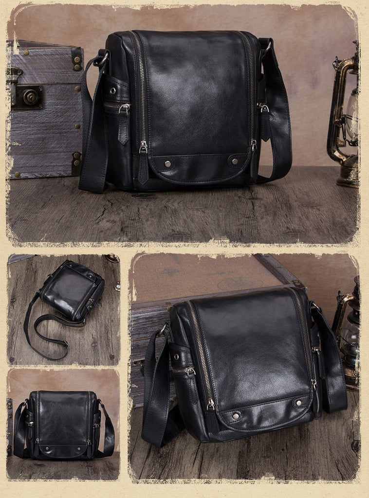 Brown Mens Vintage Vertical Small Messenger Bag Black Leather Side Bag Couier Bag for Men