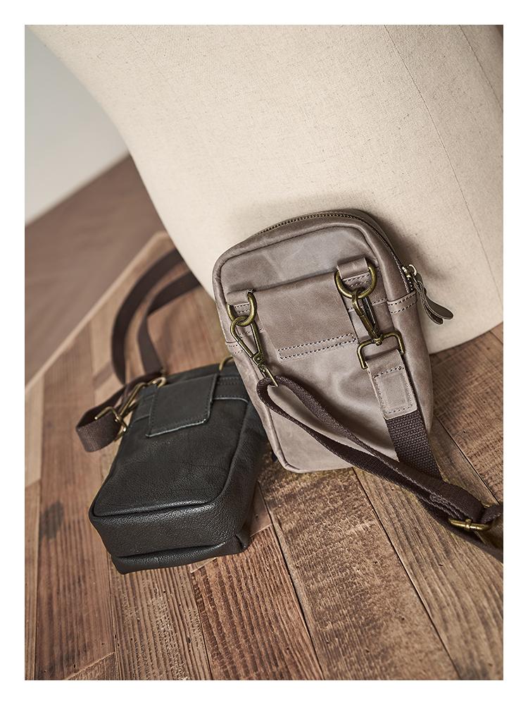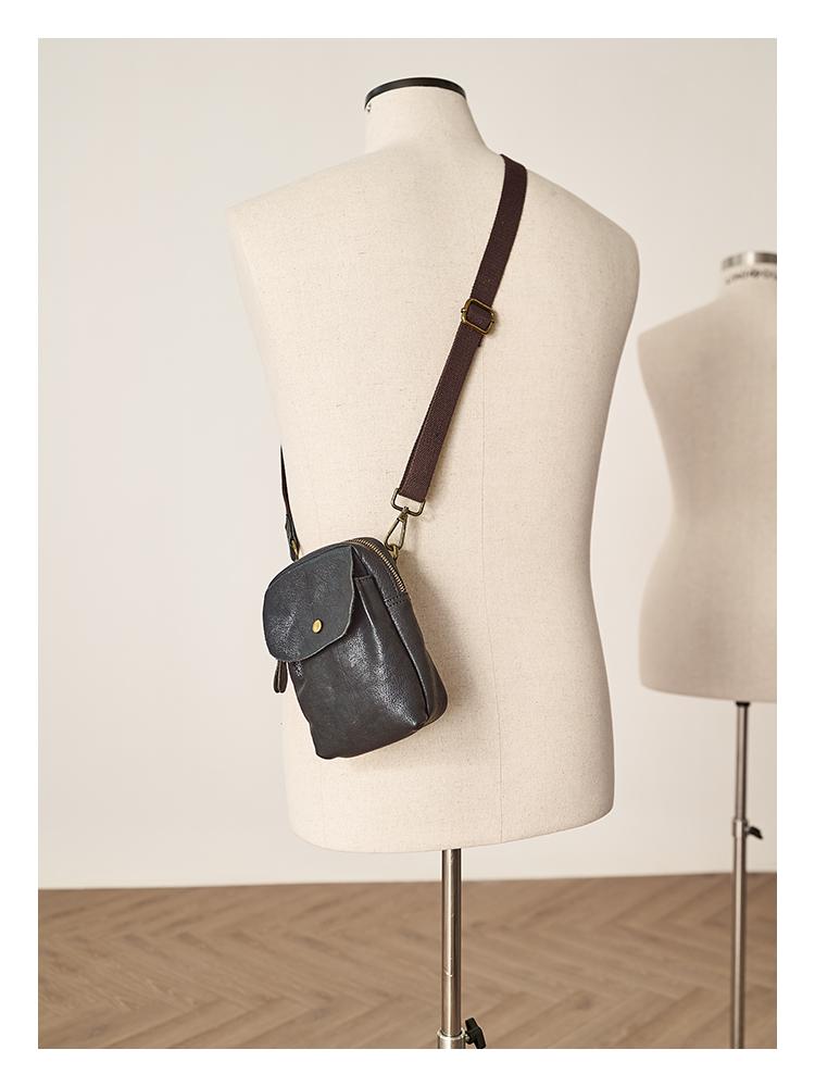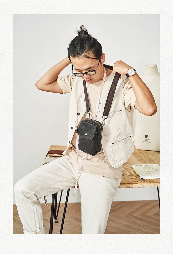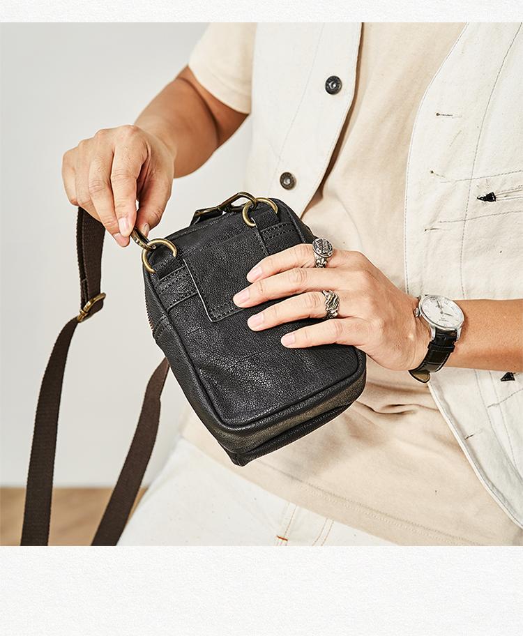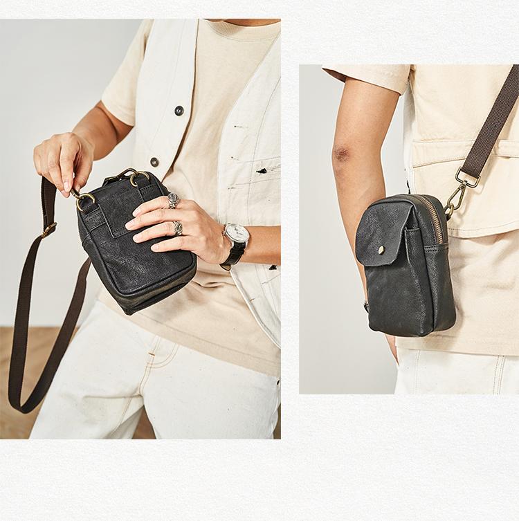 Design: Cool Black Leather Mens Small Messenger Bag Courier Bag Chest Bag Phone Side Bag for men